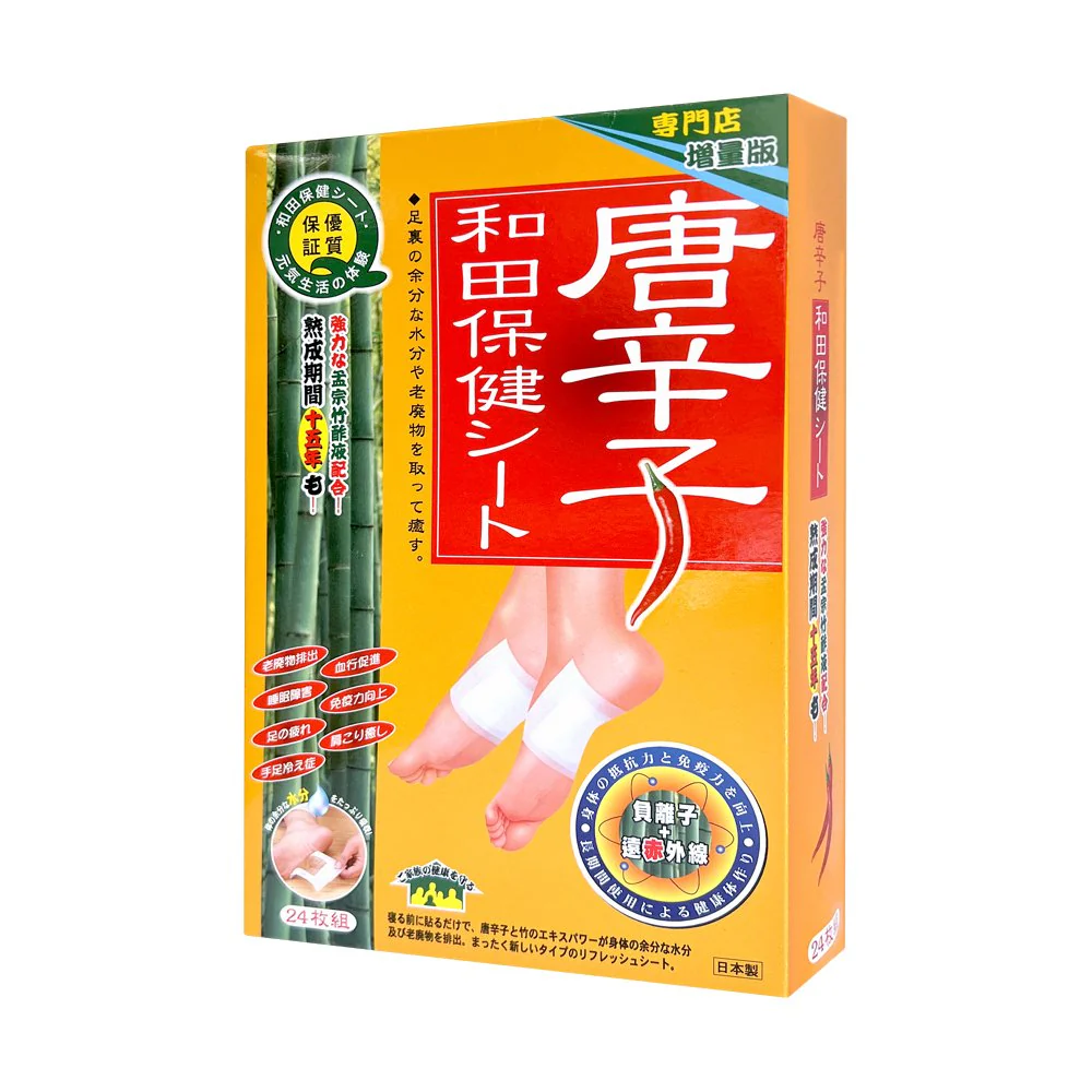 和田唐辛子保健貼 - 清除濕重、改善體質 - 有助促進血液循環、加速新陳代謝 - 消腫舒痛及祛濕排毒 - 使用優質孟宗竹經15年熟成之竹酢原液 -香港醫護學會委託註冊中醫師進行面診評估之研究: *89%濕重有助改善 *87%血氣有助改善 *81%體質有助改善 •香港醫護學會認可產品 •採用日本優質孟宗竹提煉而成的15年期竹酢原液 •能於短時間內將身體濕氣、多餘水分抽出體外 •有助促進血液循環、加速新陳代謝功效 •改善身體疲勞、四肢痠軟、手腳冰冷狀況 •添加唐辛子精華,感覺溫暖,功效更明顯 優質天然純竹酢 (45%)*、甲殼素、纖維素、維他命C等多種天然珍貴材料,配合唐辛子(辣椒)精華煉製而成。 *天然純竹酢是採用成長期4年之日本最優質孟宗竹提煉成竹酢原液,經長達15年之發酵熟成過程,再以噴霧法製成粉末而不損其功效,蘊含極豐富及珍貴的有機化合物,絕對保存了竹樹原有之無窮生命力。 1. 將膠貼布放平,把膠貼布上較大一面的底紙撕掉下來。 2. 將保健貼粉包印有字樣一面向下貼在膠貼布中間,而保健貼粉包全白色一面側向上。 3. 固定保健貼粉包後,把膠貼布剩餘底紙撕掉,然後貼於身體適當的部位。 4. 在睡前將保健貼貼於手掌或腳底位置,貼後盡量減少走動,以免膠貼布鬆脫或移位,然後安睡至明早,約8小時後撕掉,使用後用清水或濕紙巾清理便可。 大人、5歲或以上小童皆可使用 - 濕重疲倦、睡眠欠佳人士 - 血液循環欠佳及手腳冰冷人士 - 生理周期不適、腹部谷脹女性 - 長時間站立或坐著,工作過勞及缺少運動人士 - 長期腰痠背痛、肩頸不適人士 - 手腳關節不適或手腳痲痺人士 - 體內濕毒積聚而引致皮膚過敏人士 - 體內濕毒積聚而引致皮膚過敏人士