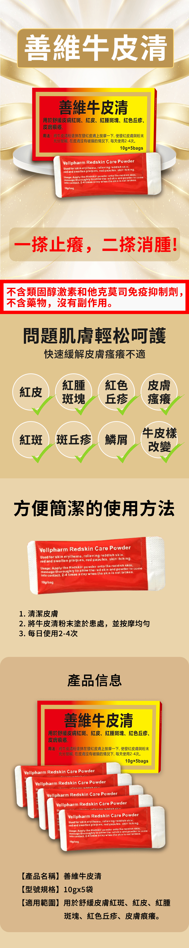 善維牛皮清 用於舒緩皮膚紅斑紅皮紅腫斑塊紅色丘疹皮膚痕癢。 善維牛皮清不含藥物, 不含類固醇激素和他克莫司tacrolimus等免疫抑制物。一搽止癢,二搽消腫! 用法: 皮膚出現紅腫瘙癢脫皮發乾,先用善維軟膏或家裡在用的普通的潤膚霜(軟膏只是有粘附牛皮清粉末的作用)塗在皮膚上,撒上足夠的牛皮清粉末。 如果皮膚出現瘙癢及破皮出血起水泡滲血及開裂的情況,直接在濕疹處撒上足夠的牛皮清粉末。 將牛皮清粉塗抹在發紅皮膚上按摩一下, 等牛皮清粉末和皮膚充分接觸, 慢慢止癢消腫,每天使用2-4次。 將善維牛皮清粉足夠量地、長時間地涂或敷在上效果最佳的!
