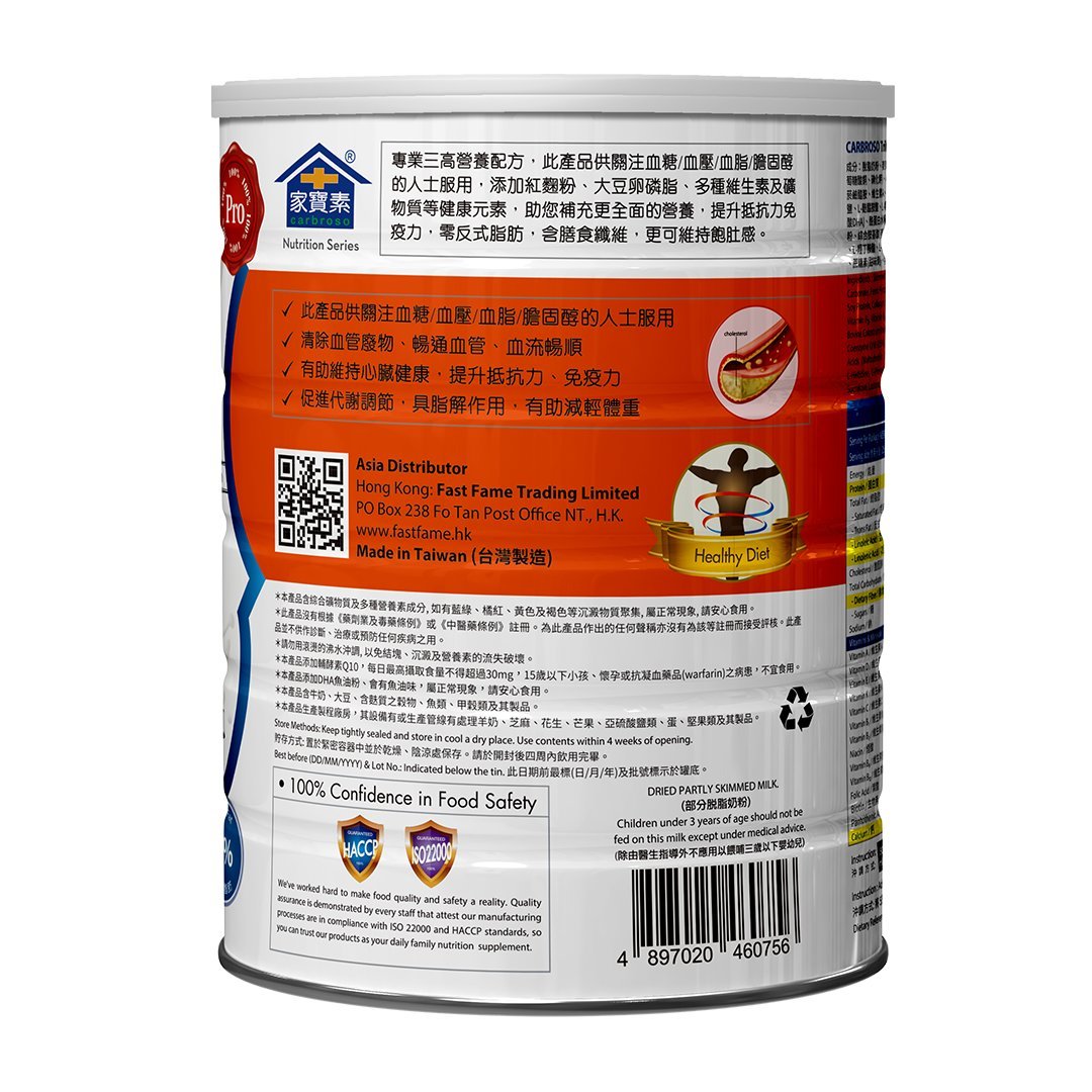 主要營養及功能: 此產品供關注血壓、血糖、血脂 / 膽固醇的人士服用 高鈣:1200毫克 / 100克 改善血管暢通彈性 提升抵抗力免疫力 零膽固醇:0毫克 / 100克 100% 紐西蘭奶源 有助減少膽固醇在血管積聚,且平衡血壓,促進血液循環,健腦及增進記憶 沖調方法: 將5匙奶粉(約25克) 加入150毫升溫水中,攪拌均勻至徹底溶解。 貯存方法: 置於緊密容器中並於乾燥、陰涼處保存。請於開封後一個月內飲用完畢。 成份: 脫脂奶粉、麥芽糊精、芥花油粉、全脂奶粉、糊精纖維、綜合礦物質(磷酸鈣、碳酸鈣、焦磷酸鐵、葡萄糖酸鋅、本多酸鈣、葡萄糖酸銅、碘化鉀)、小麥纖維、乳清蛋白、分雜大豆蛋白、膠原蛋白、關華豆漿、香料、二氧化矽、綜合維生素(維生素C、維生素E、菸鹼醯胺、維生素A、維生素D3、維生素B12、維生素B1、維生素B2、維生素B6、維生素K1、葉酸、生物素)、菊苣纖維、葡萄糖胺鹽酸鹽、L-麩醯胺酸、L-精胺酸、果寡糖、大豆卵磷脂、玉米澱粉、乳牛初乳(含免疫球蛋白IgG)(50%)、寇氏隱甲藻萃取物(含二十二碳六烯酸DHA)、酪蛋白水解物(含酪蛋白磷酸胜肽CPP)、輔酵素Q10(2.5%)、蘋果萃取物(含蘋果多酚)(33%)、銀杏果粉、DHA魚油粉、紅麴粉、綜合胺基酸(麥芽糊精、L-麩酸、L-天冬胺酸、L-脯胺酸、L-白胺酸、胺基乙酸、L-𝜶-胺基異戊酸、鹽酸L-二胺基己酸、L-異白胺酸、L-羥丁胺酸、L-精胺酸、L-組胺酸、L-笨丙胺酸、DL-蛋胺酸、L-酪胺酸、L-色胺酸)、金盞草萃取物(含葉黃素)(0.5%)、紅景天萃取物、蔗糖素(甜味劑)、乳糖、牛磺酸、綜合酵素(乳糖、鳳梨萃取物、糖化酵素、纖維分解酵素、青木瓜萃取物、麥芽糊精)。 *此產品沒有根據《藥劑業及毒藥條例》或《中醫藥條例》註冊。為此產品作出的任何聲稱亦沒有為進行該等註冊而接受評核。此產品並不供作診斷、治療或預防任何疾病之用。