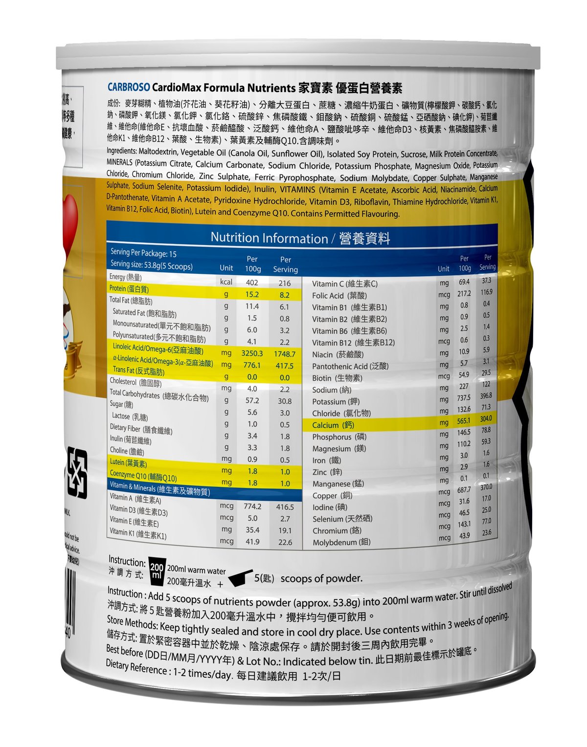 專業護心優蛋白配方,選用優質蛋白質,蛋白質比例高,含Q10、高鈣、酪蛋白磷酸胜肽、多種維生素及礦物質等元素,能有助手術後及病後保養,有助維持心臟健康,提升肌肉力量、加強抵抗力、免疫力。 ✓ 紐西蘭酪蛋脂水解物 ✓ 輔酶素Q10有助心臟健康 ✓ 補充優質蛋白質,全面補充身體每日所需 ✓ 有助維持心臟健康,提升抵抗力、免疫力 ✓ 適合手術後及病後迅速保養 ✓ 含纖護腸、有助腸道暢通,減少便秘 ✓ 0%反式脂肪 成份:植物油粉、麥芽糊精、甜乳清粉、分離大豆蛋白、菊苣纖維、蔗糖、高油酸葵花油粉、乳清蛋白、亞麻仁油粉、綜合礦物質(磷酸鈣、碳酸鈣、焦磷酸鐵、葡萄糖酸鋅、本多酸鈣、葡萄糖酸銅、碘化鉀)、中鏈脂肪酸粉、大豆油粉、芥花油粉、香料、二氧化矽、綜合維生素(維生C、維生素E、菸鹼醯胺、維生素A、維生素D3、維生素B12、維生素B1、維生素B2、維生素B6、維生素K1、葉酸、生物素)、鉻酵母、鉬酵母、玉米澱粉、酪蛋白水解物(含酪蛋白磷酸胜肽CPP)、鈉豆發酵粉(含鈉豆激酶)(2.5%)、紅麴粉、銀杏果粉、高山版孢黴發酵產物(含花生四烯酸AA)、乳糖、牛磺酸、輔酶素Q10(2.5%)、綜合蔬果抽出物(乳糖、鳳梨萃取物、糖化酵素、纖維分解物酵素、青木瓜萃取物、麥芽糊精)、克菲爾乳酸菌、金盞草萃取物(含葉黃素)(0.5%)
