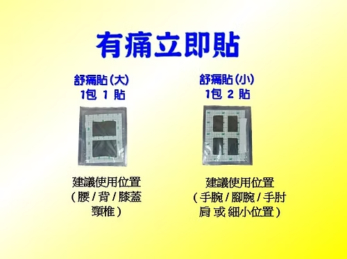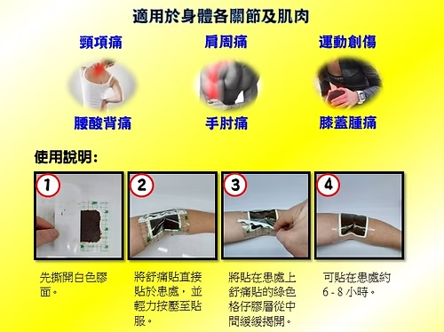 「舒痛貼」以黃飛鴻夫人莫桂蘭師太承傳的百年傳統跌打藥方為本,加上多年來用藥及製藥經驗製作而成。全品以傳統古方草本選取其有效成,能迅速發揮效用,為備受痛症困擾之大眾提供一個可治癒痛症的不二之選。選用醫療級數的薄貼紙製作貼製作,透氣又防水,固皮膚敏感情況大大減低,先搽活絡跌打酒,再敷貼 6-8 小時,功效顯著。 【包裝規格】 每包 1 貼 ( 大 ) 建議使用位置 ( 腰 / 背 / 膝蓋 頸椎 ) 每包 2 貼 ( 小 ) 建議使用位置 ( 手腕 / 腳腕 / 手肘 肩 或 細小位置 ) 【功能】 驅風去濕、去腫、止痛散瘀、舒筋活絡、行氣活血之功效。 【主冶】 能舒暢肌肉疲勞、腫痛、勞損、關節痺痛、膝蓋腫痛、 頸項痛、肩周痛、手肘痛、腰酸背痛、足跟痛 等多種新傷舊患痛症。 【用量及用法】 先搽活絡跌打酒,再敷貼 6-8 小時。每天可使用 1 次。 【注意事項】 ‧ 皮膚破損處忌用。 ‧ 本品只供外用,忌口服。 ‧ 懷孕及哺乳婦女不宜使用。 ‧ 兒童必須在成人監護下使用。 ‧ 請將此藥品放在兒童不能接觸的地方。 ‧ 敷貼後如對本品有敏感或不適,請停止使用。