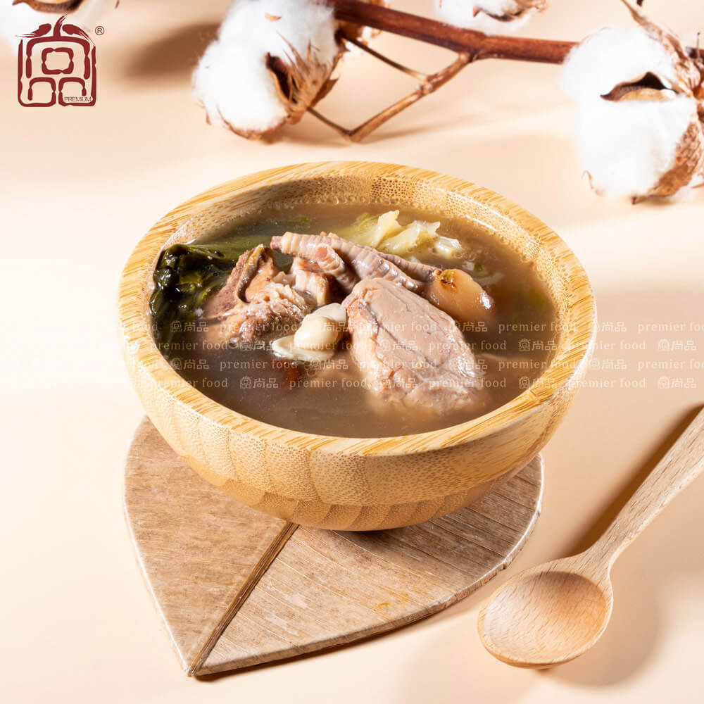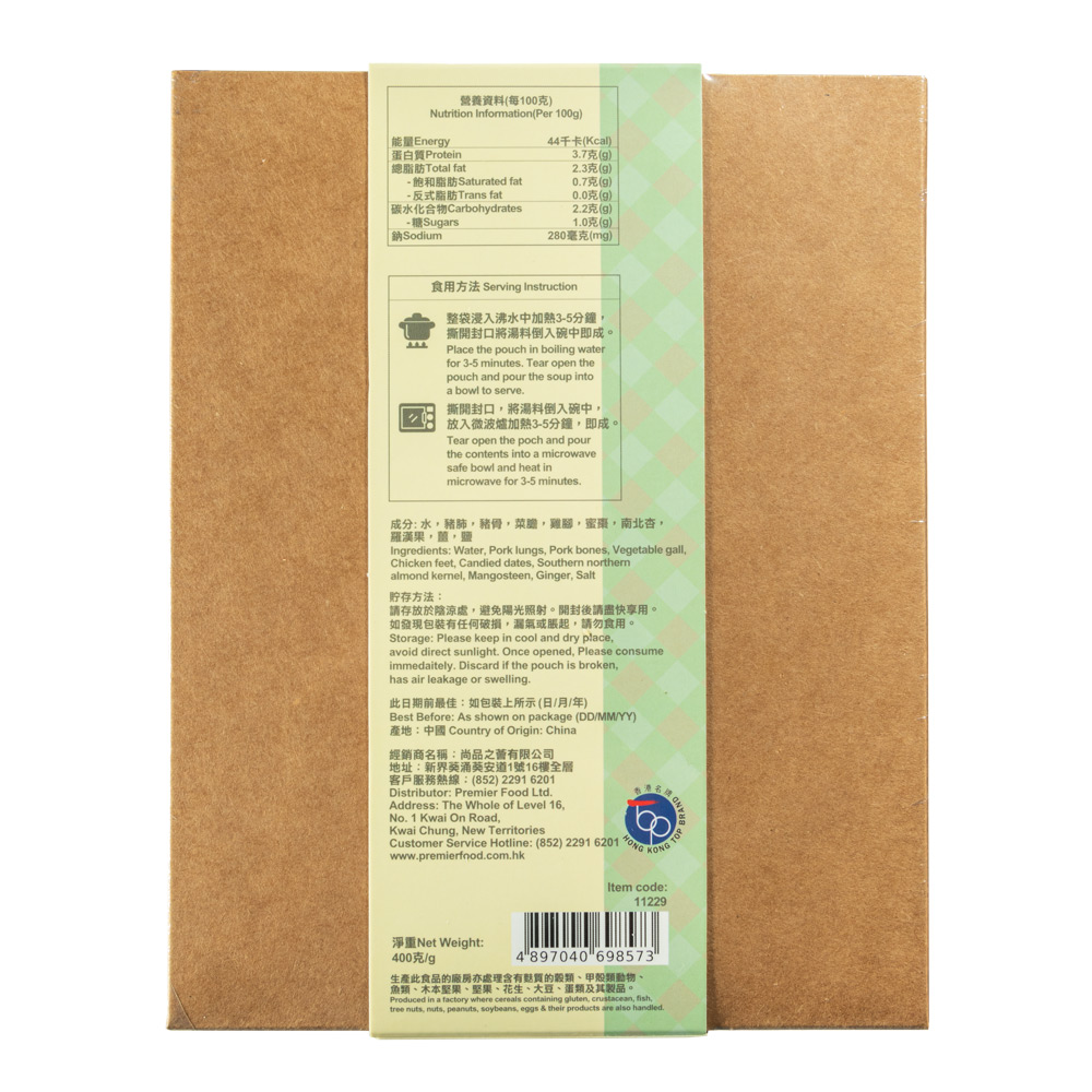 南北杏燉豬肺豬脊骨湯(400克) 尚品足料即飲湯包,加熱3分鐘即飲,無添加味精、防腐劑、人造色素!採用日本「高溫高壓滅菌技術」可常溫保存,一次過滿足方便、好味又養生的食療即食湯包。 湯包功效: 補肺止咳,生津開胃,可助人體迅速消除疲勞 適合人士: 1. 適合肺虛久咳、慢性支氣管炎緩解期人士 2. 捱夜工作、經常用腦的忙碌香港人 國際食品安全認證: 湯包廠房通過ISO22000、HACCP國際標準食品安全衛生認證,品質信心保證 成份: 水,豬肺,豬骨,菜膽,雞腳,蜜棗,南北杏,羅漢果,薑,鹽 食用方法: 整袋坐熱3-5分鐘 或 剪開包裝倒入碗中放入微波爐加熱3分鐘 *圖片只供參考,因有不同批次一切以實物為準。尚品堅持正品正貨,客人可放心使用。
