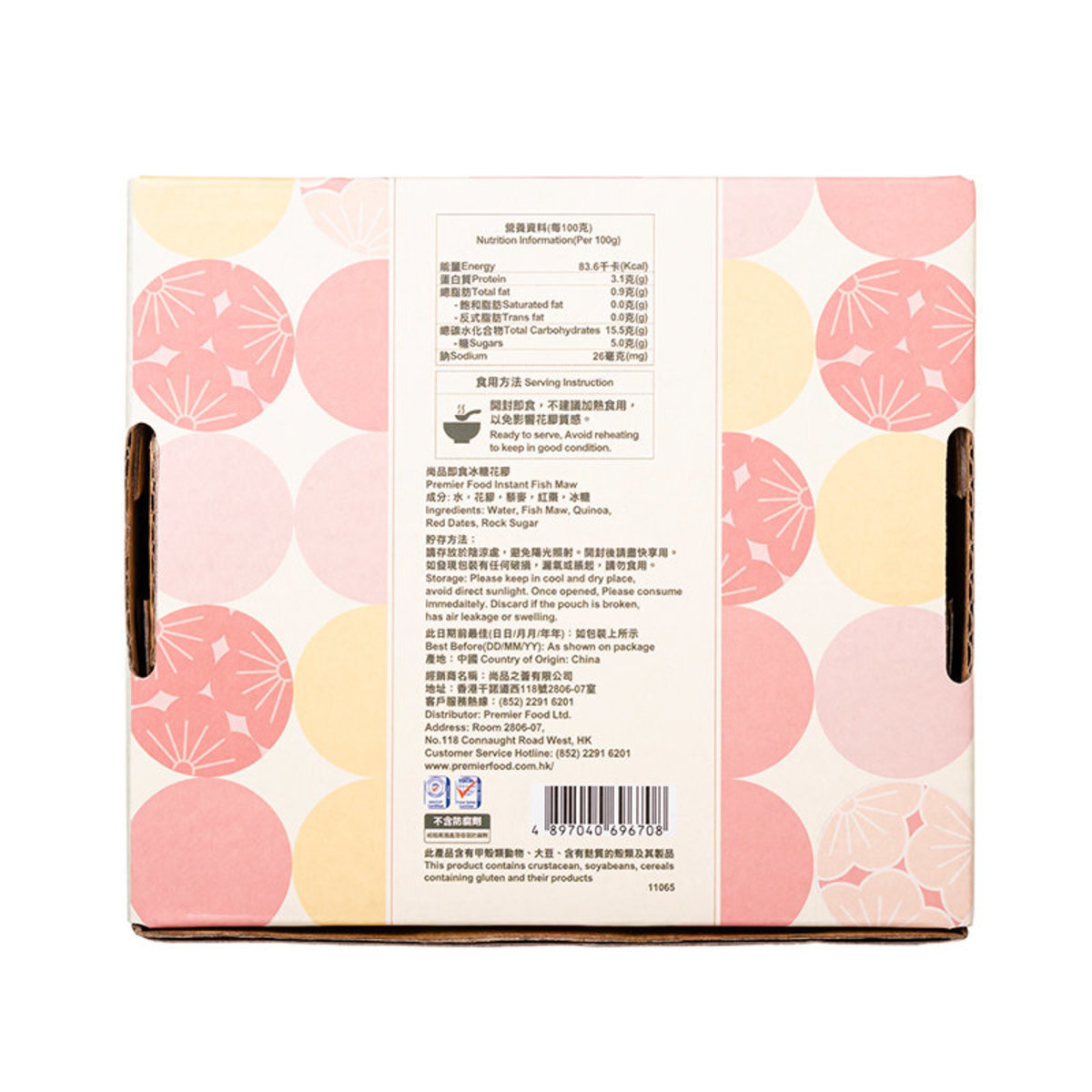 尚品即食冰糖花膠(升級配方) 尚品精選天然深海花膠,肉厚Q彈,味道清甜,低卡路里零罪疚感,瘦身養顏糖水! 功效: 內含花膠、紅棗、藜麥等天然健康食物,提升皮膚彈性及水份 國際食品安全認證: 廠房通過ISO22000、HACCP國際標準食品安全衛生認證,品質信心保證 適合人士: 一般人士均可食用 食用方法: 即開即食味道口感最佳 *圖片只供參考,因有不同批次一切以實物為準。尚品堅持正品正貨,客人可放心使用。 規格:178克