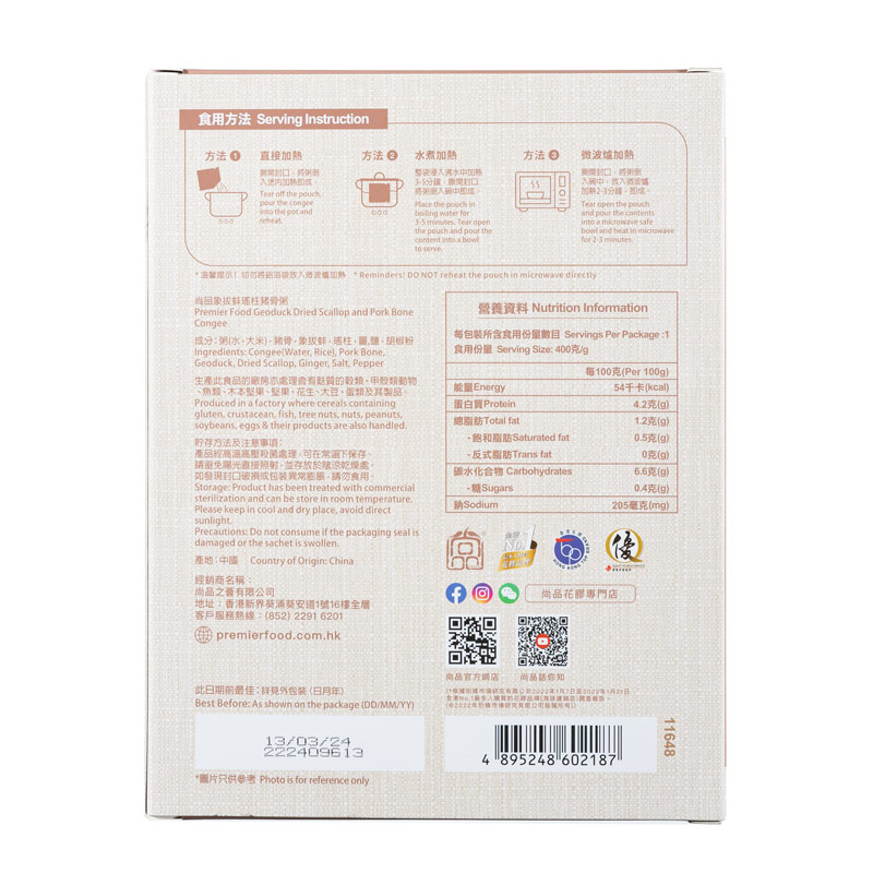 尚品象拔蚌瑤柱豬骨粥 無添加味精、色素、防腐劑,經高溫殺菌處理,可常溫保存。即開即食,方便衛生。加熱3分鐘,熱食風味更佳。 功效: 強腎養肝,明目潤燥 國際食品安全認證: 廠房通過ISO22000、HACCP國際標準食品安全衛生認證,品質信心保證 成份: 粥(水,大米),豬骨,象拔蚌,瑤柱,薑,鹽,胡椒粉 *圖片只供參考,因有不同批次一切以實物為準。尚品堅持正品正貨,客人可放心使用。 商品規格 規格 400克