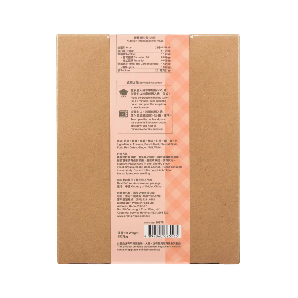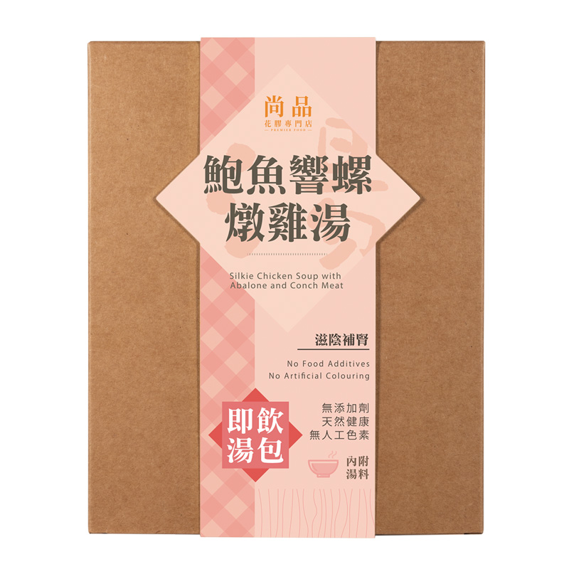 鮑魚響螺湯 尚品足料即飲湯包,加熱3分鐘即飲,無添加味精、防腐劑、人造色素!採用日本「高溫高壓滅菌技術」可常溫保存,一次過滿足方便、好味又養生的食療即食湯包。 湯包功效: 鮑魚響螺滋陰補腎、強身健脾、可助人體迅速消除疲勞 適合人士: 1. 脾胃欠佳、作息飲食不定時 2. 睡眠質素差、熬夜少眠者 3. 想保持青春的貪靚人士 4. 產後坐月媽媽及女士日常飲用 國際食品安全認證: 湯包廠房通過ISO22000、HACCP國際標準食品安全衛生認證,品質信心保證 成份: 水,鮑魚,響螺,竹絲雞,豬展,紅棗,薑,鹽 食用方法: 整袋坐熱3-5分鐘 或 剪開包裝倒入碗中放入微波爐加熱3分鐘 *圖片只供參考,因有不同批次一切以實物為準。尚品堅持正品正貨,客人可放心使用。