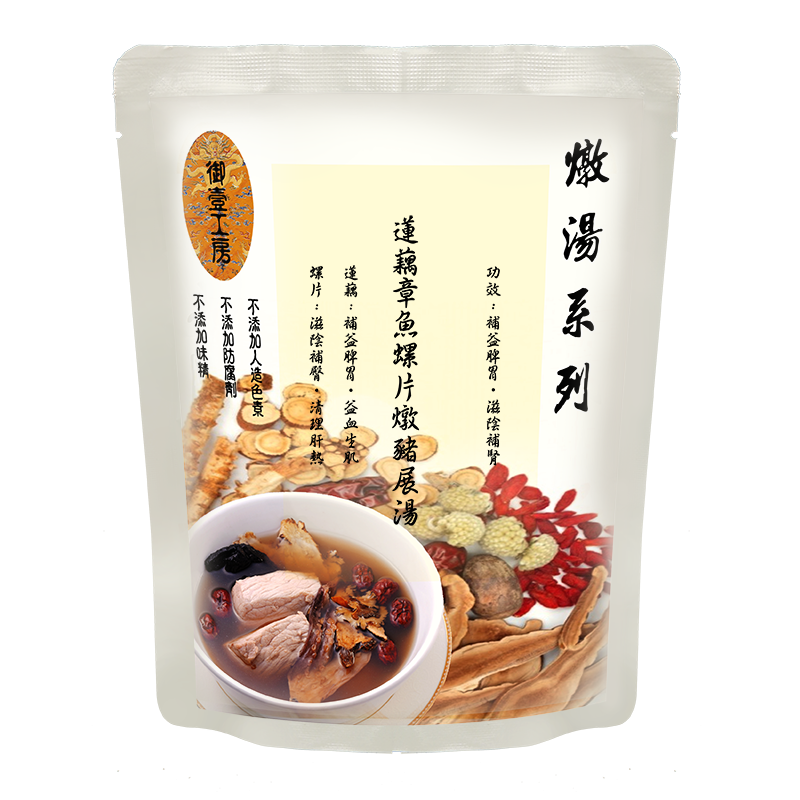 功效 : 補益脾胃 、滋陰補腎 成分 : 水,豬展,蓮藕,螺片,章魚,茨實,紅棗,薑,鹽 淨重400克 無添加味精, 防腐劑, 人造色素 加熱3分鐘即可飲用 內含湯渣,真材實料 無需冷藏,常溫存放