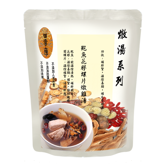 功效 : 補肝腎,滋陰養顏,補充骨膠原 成分 : 水,雞,豬展,鮑魚,花膠(魚類製品),螺片,冬菇,淮山,紅棗,杞子,薑,鹽 淨重400克 無添加味精, 防腐劑, 人造色素 加熱3分鐘即可飲用 內含湯渣,真材實料 無需冷藏,常溫存放