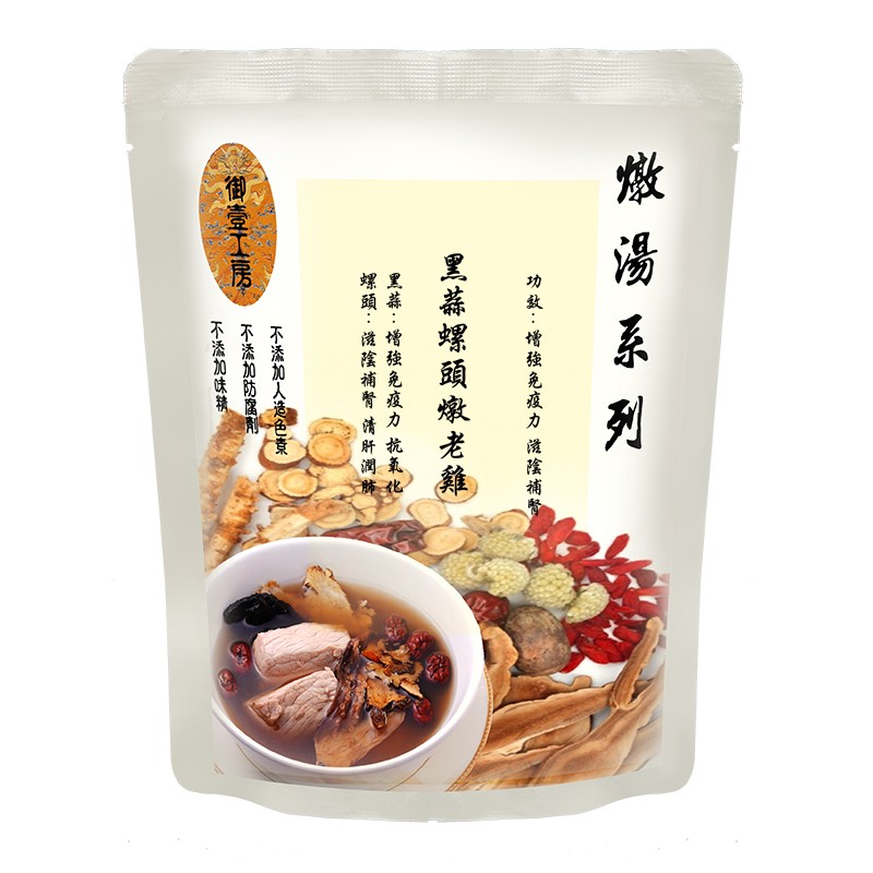 功效 : 增強免疫力, 滋陰補腎 成分 : 水,老雞,豬展,黑蒜,螺頭,淮山,玉竹,紅棗,薑,杞子,鹽 淨重400克 無添加味精, 防腐劑, 人造色素 加熱3分鐘即可飲用 內含湯渣,真材實料 無需冷藏,常溫存放