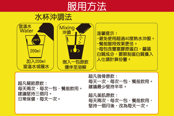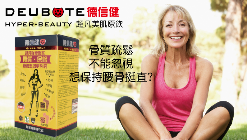 大部份人年齡到40歲,骨質密度下降變得明顯,而更年期後女性因為體內荷爾蒙分泌的變化,加劇了鈣的流失,主要由於膠原蛋白產生減慢所致,另外孕婦由於胎兒需要大量鈣質,也會使孕婦有機會造成骨質疏鬆,另外一些長期服用類固醇人仕,由於出現抑制膠原蛋白產生的副作用,也是骨質疏鬆的高危人仕。 骨質疏鬆 會導致變矮、寒背,產生痛症,亦使骨骼脆弱,令患者長期承受痛苦,導致行動不便,甚至危及生命。 骨骼的鈣的流失主要是缺乏膠原蛋白所致,雖然補鈣是一個必要的手段,但當骨質內膠原蛋白日漸減少,沒有膠原蛋白的承載,補鈣的效果就越來越低,人體也不能大量服用鈣片,而且當骨質不能鎖定鈣質,補充再多也只會隨尿排出,膠原蛋白不足就如水桶只得一個,水滿了,就需要增加水桶。 超凡強骨原飲透過水解微分子技術,讓腸道容易吸收,並篩選適合骨質的膠原蛋白肽鏈結構,更能針對骨質的膠原補充。 超凡強骨原飲的臨床研究 2011年,ALVES RD和DEMMERS JA等學者對180名骨質正在減少的女性進行雙盲研究,分為服用Hyper Bone 5g組別和安慰劑對照組別,持續十二個月並以DXA骨質掃瞄測量其變化,結果顯示Hyper Bone作補充品能顯著改善骨質密度,增加了BMD (Bone Mineral Density)骨礦物密度,而服用安慰劑組別骨質則持續下跌。 什麼是膠原蛋白 膠原蛋白是身體構成的重要蛋白質,具伸張力的網狀結構成為細胞之間的重要支撐和承載角色,而膠原蛋白可透過自體產生,隨著年齡增長,新陳代謝減慢,膠原蛋白日漸減少,而產生不同退化問題,例如皮膚缺乏膠原則會失去承托力而產生皺紋、鬆弛和缺乏保濕能力;關節軟骨也因此密度降低、缺乏彈性,失去保護關節硬骨能力,造成關節痛;同時也會影响骨質中對鈣質的承載力,促使鈣大量流失,形成骨質疏鬆。 很多人就會想到,進食富含膠原蛋白的食物去補充,可惜是在一般食物上的膠原蛋白分子量巨大,達到30萬道爾頓單位,當經過消化系統,結構破壞,最後只會像一般蛋白質以胺基酸形態吸收。 為何需要『水解生物活性微膠原蛋白』 德信健超凡原飲中的水解生物活性微膠原蛋白,是經過微分子化,分子量微細至3000道爾頓單位,能於水中溶解,自然地減少消化系統的處理程度,在腸道直接吸收,吸收率高達95%;並且保留不同形態『肽鏈』結構,再利用高科技把身體不同組織結構所需的肽鏈類型篩選,從而針對不同退化的需要,而推出了HYPER JOINT超凡關節原飲、HYPER BONE超凡強骨原飲和HYPER BEAUTY超凡美肌原飲,從而發揮更具針對性的效用。 研究證實:服後12小時內腸道吸收95%(Oesser et al.1999);檢測證實血液中膠原蛋白重要成分羥脯胺酸濃度明顯上升(岩井et al.2005)。 研究證實:服後12小時內腸道吸收95%(Oesser et al.1999);檢測證實血液中膠原蛋白重要成分羥脯胺酸濃度明顯上升(岩井et al.2005)。