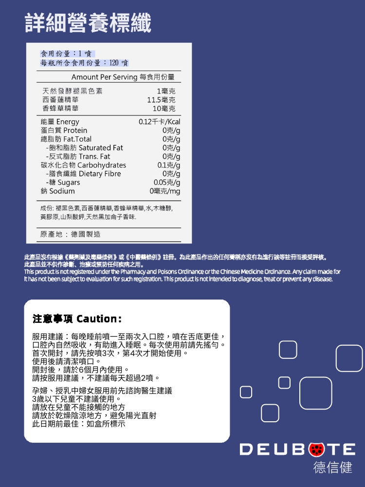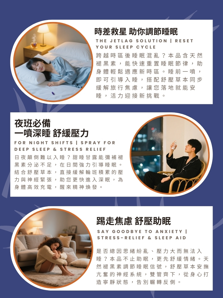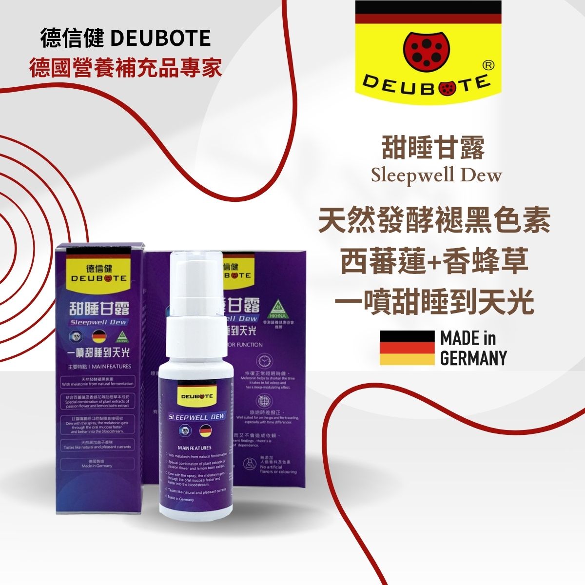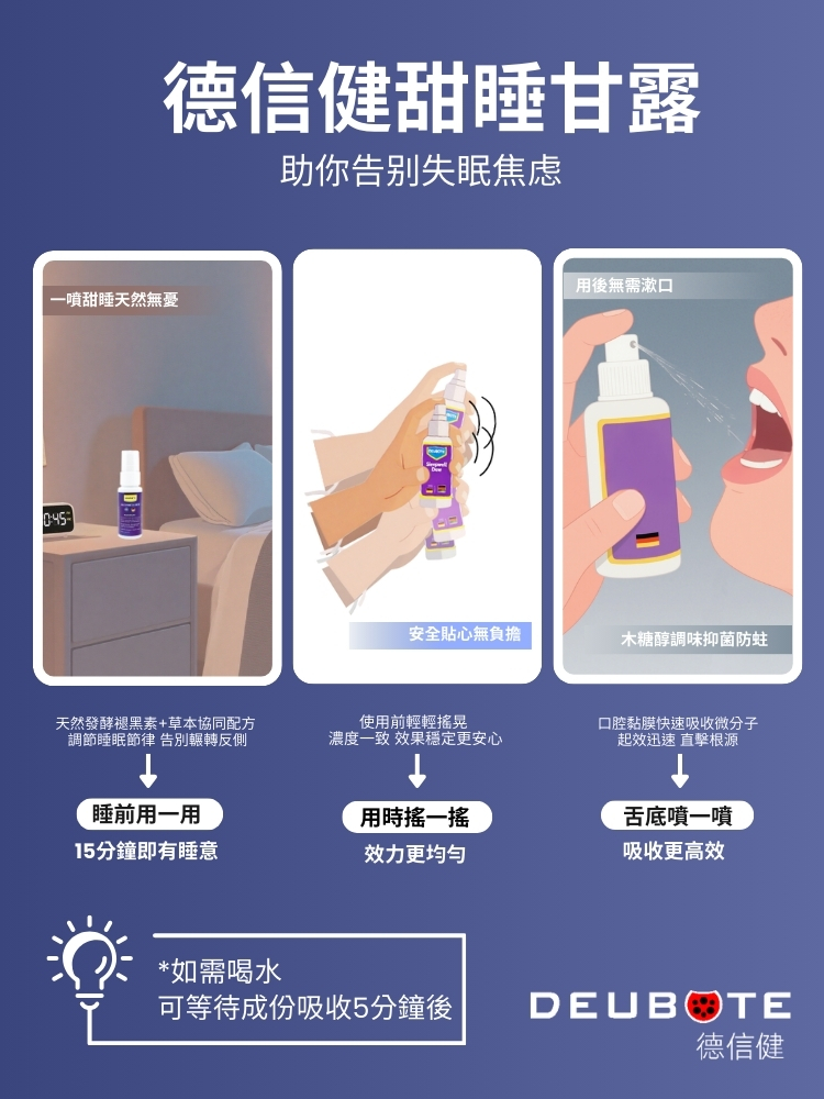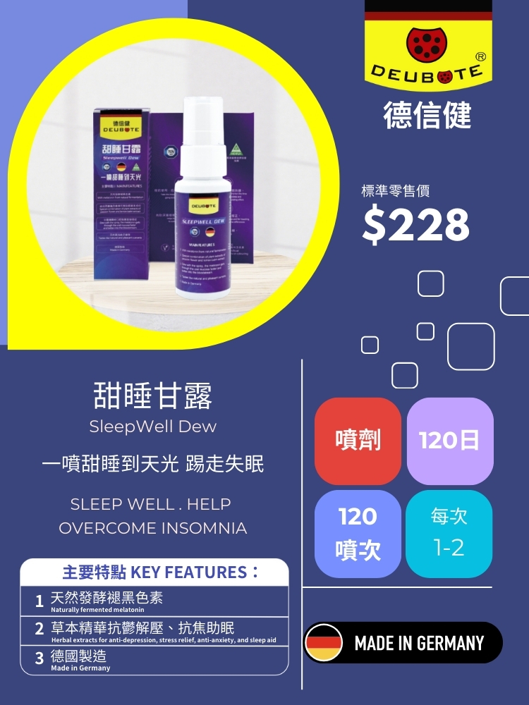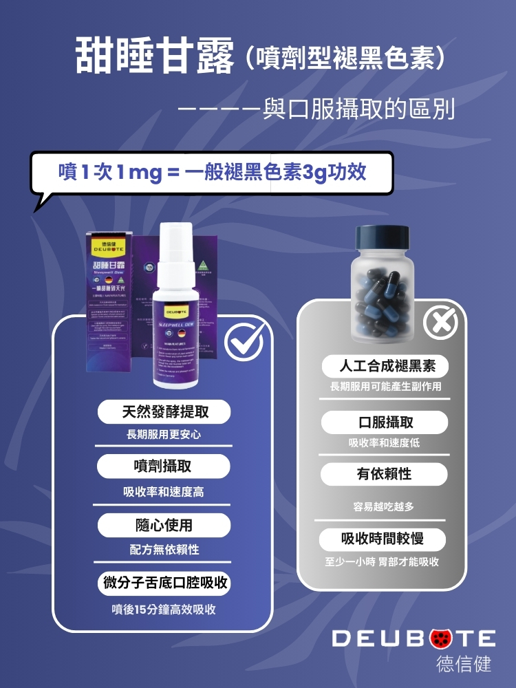 甜睡甘露使用-天然發酵褪黑色素( 退黑色素 )安全又有效 香港人情緒壓力爆錶,睡眠時間不足還有失眠 或不熟睡,已成為常態,但長時間失眠,工作沒精神,傷肝又傷皮膚,吃藥又有依賴性,不如選擇天然補充品,例如褪黑色素( 退黑色素 )安全又有效。 人體從松果體細胞合成出褪黑色素 / 退黑色素,因應晝夜節律產生,從而讓人體睡眠和睡醒,當人們因為體質的變化,心理壓力,焦慮等等就會影响其產生,導致失眠或影響睡眠質素。 口服攝取褪黑色素 /退黑色素 則能改善,以往多數的褪黑色素以合成為主,甜睡甘露所含的褪黑色素是從天然漿果(例如葡萄、黑櫻桃、黑加侖子等等)發酵提取,工藝複雜亦要提純,成本比人工合成高出多倍,但來自天然,長期服用時自然更為安心。 加入草本精華,全方位解決,好瞓兼熟睡。 西蕃蓮 / 西番蓮: •含豐富的類黃酮與生物鹼,恬靜心靈,舒緩神經緊張。 •減壓抗焦慮 •可舒緩神經疼痛、睡眠失調或焦慮不安,從而放鬆緊繃的心情。 香蜂草: •減輕焦慮、增強記憶力、幫助睡眠 •藥理學研究顯示,香蜂草可幫助深度入眠、心情平靜且注意力較為集中。 •有助緩解緊張和煩躁情緒,提高入睡效果。 更有效的吸收褪/ 退黑色素 的方法: -以噴劑從舌底和口腔粘膜吸收,更具吸收率和速度,所以一噴只有1mg 褪黑色素/ 退黑色素,但比服用3克褪/ 退黑色素 膠囊更能發揮作用,而且只需臨睡前15分鐘使用即可,。 -天然黑加侖子令人愉快的味道。 -以木糖醇作調味,本身有抑菌防蛀牙作用,所以臨睡向舌底噴一至兩次,不用漱口直接睡覺。 *褪黑色素 = 退黑色素 , 正確來說是褪黑色素