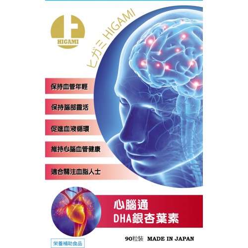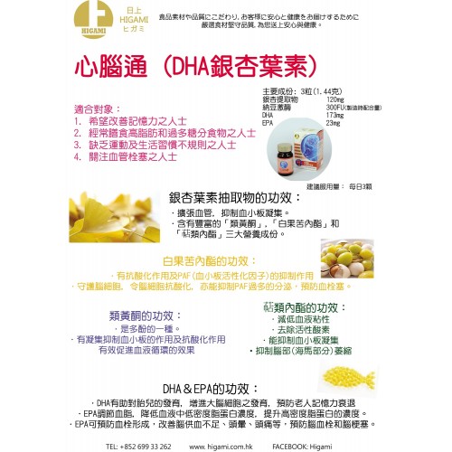 心腦通 (DHA銀杏葉素) 內含量:43. 38g (一顆重量482mg[內含量300mg] x 90 顆) 建議服用量: 一日三顆 適合對象: 1. 希望改善記憶力之人士 2. 經常膳食高脂肪和過多糖分食物之人士 3. 缺乏運動及生活習慣不規則之人士 4. 關注血管栓塞之人士 銀杏葉素抽取物的功效: .擴張血管, 抑制血小板凝集。 .含有豐富的「類黃酮」,「白果苦內酯」和 「萜類內酯」三大營養成份。 白果苦內酯的功效: .有抗酸化作用及PAF(血小板活性化因子)的抑制作用 .守護腦細胞, 令腦細胞抗酸化, 亦能抑制PAF過多的分泌,預防血栓塞。 類黃酮的功效: .是多酚的一種。 .有凝集抑制血小板的作用及抗酸化作用 .有效促進血液循環的效果 萜類內酯的功效: .減低血液粘性 .去除活性酸素 .能抑制血小板凝集 ‧抑制腦部(海馬部分)萎縮 DHA&EPA的功效: .DHA有助對胎兒的發育, 增進大腦細胞之發育, 預防老人記憶力衰退 .EPA調節血脂, 降低血液中低密度脂蛋白濃度, 提升高密度脂蛋白的濃度。 .EPA可預防血栓形成,改善腦供血不足、頭暈、頭痛等,預防腦血栓和腦梗塞。