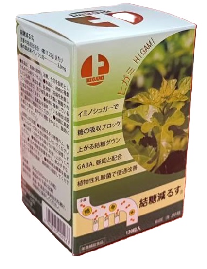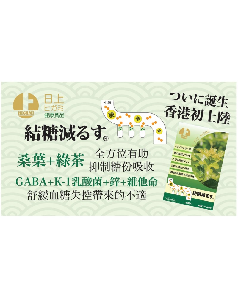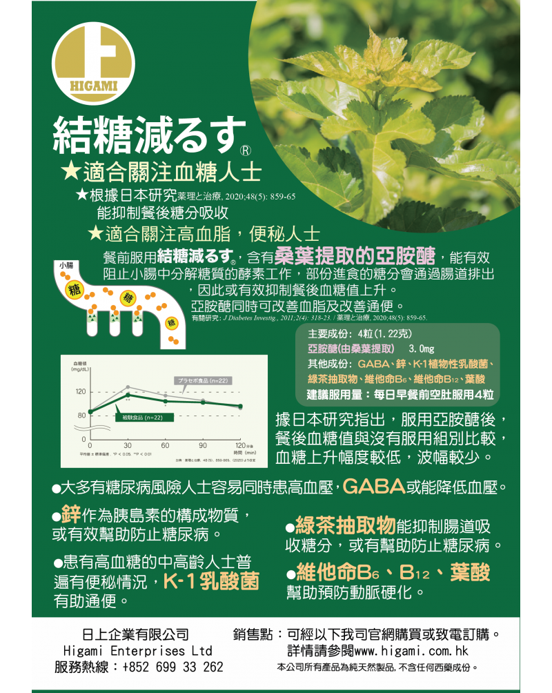 結糖減るす (結糖減流素) 每日早餐前空肚服用結糖減るす4粒 ★適合關注血糖人士 ★根據日本研究 薬理と治療, 2020;48(5): 859-65 能抑制餐後糖分吸收 ★適合關注高血脂,便秘人士 餐前服用結糖減るす,含有桑葉提取的亞胺醣,能有效阻止小腸中的糖質分解酵素工作,部份進食的糖分會通過腸道排出, 主要成份:4粒(1.22克) 亞胺醣(由桑葉提取) 3.0mg 其他成份:GABA、鋅、K-1植物性乳酸菌、 綠茶抽取物、維他命B6、維他命B12、葉酸 建議服用量:每日早餐前空肚服用4粒 據日本研究指出,服用亞胺醣後,餐後血糖值與沒有服用組別比較,血糖上升幅度較低,波幅較少。 ● 大多有糖尿病風險人士容易同時患高血壓,GABA或能降低血壓。 ● 鋅作為胰島素的構成物質,或有效幫助防止糖尿病。 ● 患有高血糖的中高齡人士普遍有便秘情況,K-1乳酸菌有助通便。 ● 綠茶抽取物能抑制腸道吸收糖分,或有幫助防止糖尿病。 ● 維他命B6、B12、葉酸作幫助預防動脈。