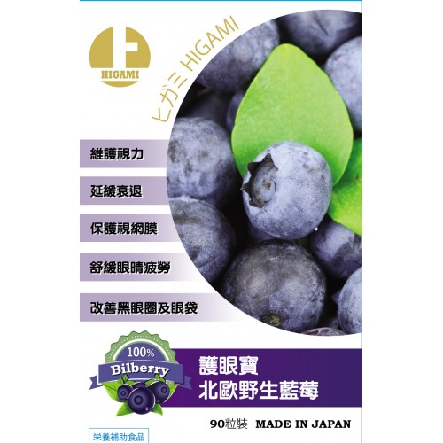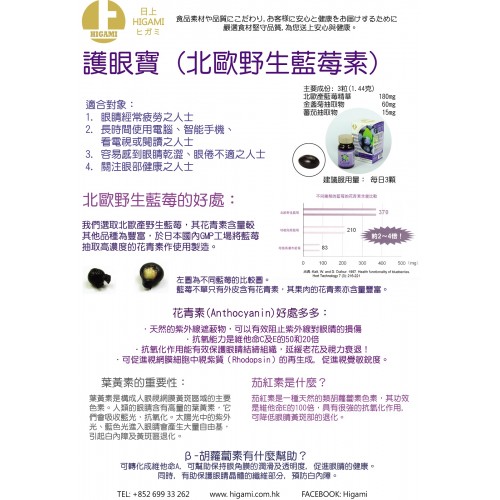 護眼寶 (北歐野生藍莓素) 內含量: 43.2g (一顆重量480mg[內含量295mg]x 90 顆) 建議服用量: 一日三顆 適合對象: 1. 眼睛經常疲勞之人士 2. 長時間使用電腦、智能手機、看電視或閱讀之人士 3. 容易感到眼睛乾澀、眼倦不適之人士 4. 關注眼部健康之人士 北歐野生藍莓的好處: 我們選取北歐產野生藍莓,其花青素含量較其他品種 為豐富,於日本國內工場將藍莓抽取高濃度的花青素作使用製造。 花青素(Anthocyanin)好處多多: .天然的紫外線遮蔽物,可以有效阻止紫外線對眼晴的損傷 .抗氧能力是維他命C及E的50和20倍 .抗氧化作用能有效保護眼睛結締組織,延緩老花及視力衰退! .可促進視網膜細胞中視紫質(Rhodopsin)的再生成, 促進視覺敏銳度。 葉黃素的重要性: 葉黃素是構成人眼視網膜黃斑區域的主要色素。人類的眼睛含有高量的葉黃素, 它們會吸收藍光,抗氧化。太陽光中的紫外光、藍色光進入眼睛會產生大量自 由基,引起白內障及黃斑區退化。 茄紅素是什麼? 茄紅素是一種天然的類胡蘿蔔素色素,其功效是維他命E的100倍,具有很強的 抗氧化作用, 可降低眼睛黃斑部的退化 β-胡蘿蔔素有什麼幫助? 可轉化成維他命A, 可幫助保持眼角膜的潤滑及透明度, 促進眼睛的健康。 同時, 有助保護眼睛晶體的纖維部分, 預防白內障。