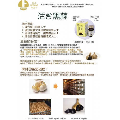 活き黑蒜 適合對象: 1.適合關注血糖人士 2.適合身體欠佳及常感疲勞人士 3.適合渾身無力、體質虛弱人士 4.適合有意改善身體情況人士 黑蒜的好處: 黑蒜具有極高的營養價值,黑蒜比大蒜的水分和脂肪等有顯著的降低, 微量元素有顯著提高,而蛋白質、糖份、維生素等則至少為大蒜的2倍以 上。黑蒜具有豐富的營養成分,所以也就有了消除疲勞、提高體力、解決 便秘、保護肝臟、提高前列腺活性、促進睡眠等多種功能。預防癌症、控制 血糖、強化內臟功能的特效食品。經過發酵和熟成後的黑蒜對調整血液流通 有很大的效果及抗氧化力。 雖然這些效果普通的大蒜也可以達到,但是黑蒜在進行發酵成熟的過程中, 在強化了原來所固有的成分力量的基礎上又產生了全新的成分,它的保健效果變得更加強大。 黑蒜的製造過程: 我們的大蒜全部採用日本青森縣產,是日本國內大蒜主要的生產地方。 採集後的大蒜在65度以下的溫度及濕度下經過一個月時間自由發酵後再經乾燥後變成黑蒜。