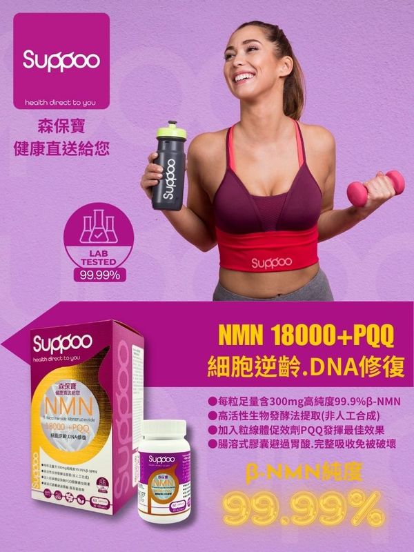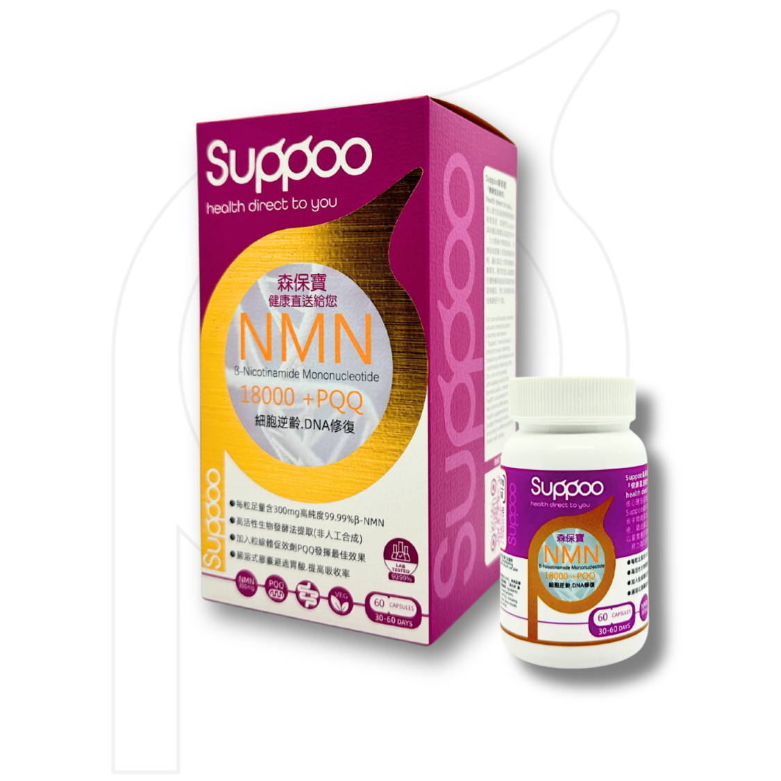 SUPPOO森保寶NMN-18000+PQQ 天然酵母NMN逆齡王60粒抗胃酸腸溶式膠囊-德國及瑞士檢測機構驗證純度達99.99% -60粒(每粒含有300mg 純度99.99%NMN) -建議每天1-3粒 25-35歲- 每天1次每次1粒 26-60歲- 每天2次每次1粒 60歲以上-每天2次每次1-2粒(每天共3粒) -香港製造 天然發酵NMN逆齡王 Suppoo森保寶 NMN18000+PQQ,採用先進生物發酵技術提取達99.9%純度高活性β-NMN,穩定性高、安全性好、無溶劑殘留、無化學合成原料,並由德國第三方獨立檢測機構Eurofins,用NMR和HPLC雙標準報告檢測純度,比其他品牌更嚴謹,(NMR以辨認真偽為目的.HPLC以純度為目的),暫時巿場上僅有我們提供這樣嚴謹的檢測。 NMN直接轉化成NAD+(諾加因子+)不需先轉化NR多重步驟,效率更好。 DR.David Sinclair 推薦NMN配方 PQQ + 每粒膠囊含有300mg上述的高活性β-NMN及10mg 同樣是生物發酵技術的PQQ,PQQ作為促效劑,促進NMN轉化為NAD+的效率,並加強細胞修復的功效。 腸溶式膠囊 提升吸收率 有效通過胃酸直接腸道吸收,從而有更好的吸收率。 您需要NMN補充劑嗎? 其實NMN本身就是細胞中的一個重要元素,如果你是25歲以下,如無身體問題或飲食影響,你的NMN應該是足夠的,但隨著年齡增長,你身體合成的NMN會減慢,這時你就要及時補充,所以我們建議正常體重25歲起可以開始每天服用一粒300mg,而到35歲起每天服用兩粒共600mg,60歲就三粒共900mg。如果體重超過90kg份量就需要多一點,下方列表可供參考。 建議每天服用量 正常體重 25-35歲 300mg (一粒) 36-60歲 600mg (兩粒) 60歲以上 900mg (三粒) 超過90kg體重 25-35歲 600mg (兩粒) 36-60歲 900mg (三粒) 60歲以上 900mg (三粒)