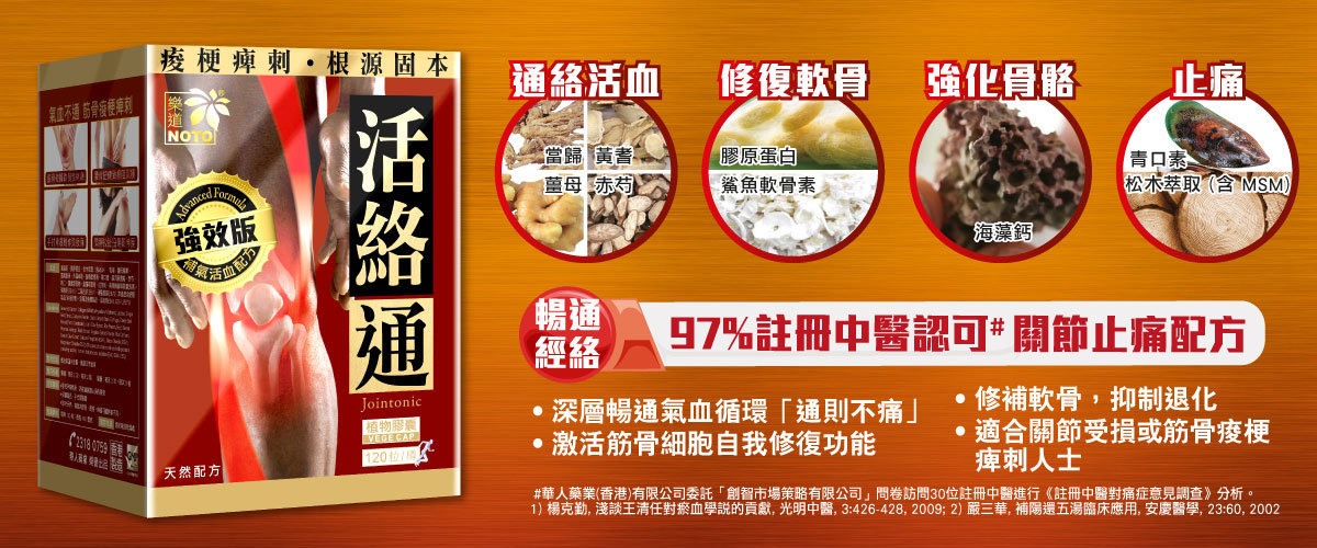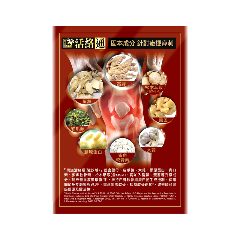 參考清朝名醫王清任的《醫林改錯》,加入黃耆、當歸等補氣、活血成分,深層暢通筋絡、軟骨、肌腱、骨骼部分的氣血循環,令筋骨固本自然修復。痠、梗、痺、麻、針刺、繃緊感覺消失;氣血通,肩膊輕鬆、腰背有力、膝頭靈活,處理多年筋骨問題。 主要成分 海藻鈣、乳糖、松木萃取(含MSM)、磷酸鈣(E341)、薑母精華、薑黃粉末、膠原蛋白、大蒜萃取、二氧化矽(E551)、硬脂酸鎂(E572)、鯊魚軟骨素、青口素、貓爪藤濃縮、赤芍、桃仁、黃耆萃取物、當歸萃取粉、紅花粉、南非鉤麻萃取(魔鬼爪)、(本產品含奶類製品(包括乳糖)、魚類及魚類製品、添加劑E341,E551, E572) 主要功能 蘊含活血成分 改善血液循環 暢通經絡 根源固本 全面修復多年筋骨問題 適用人士 跌打損傷人士 頑固骨痛人士 筋骨損傷人士 氣血不通人士 使用方法 餐後以溫水送服,建議日間食用 保健: 每日2次,每次2粒 嚴重: 每日2次,每次3粒 建議持續服用3個月為一個週期 包裝規格 每樽 120粒,每粒 480 毫克,連膠囊 產地 香港 注意事項 嬰兒、孕婦慎用,請徵詢醫護人員的意見 取材天然 – 每批次顏色、質感、味道可能略有不同 保健產品,不代替醫囑 置於陰涼乾燥處