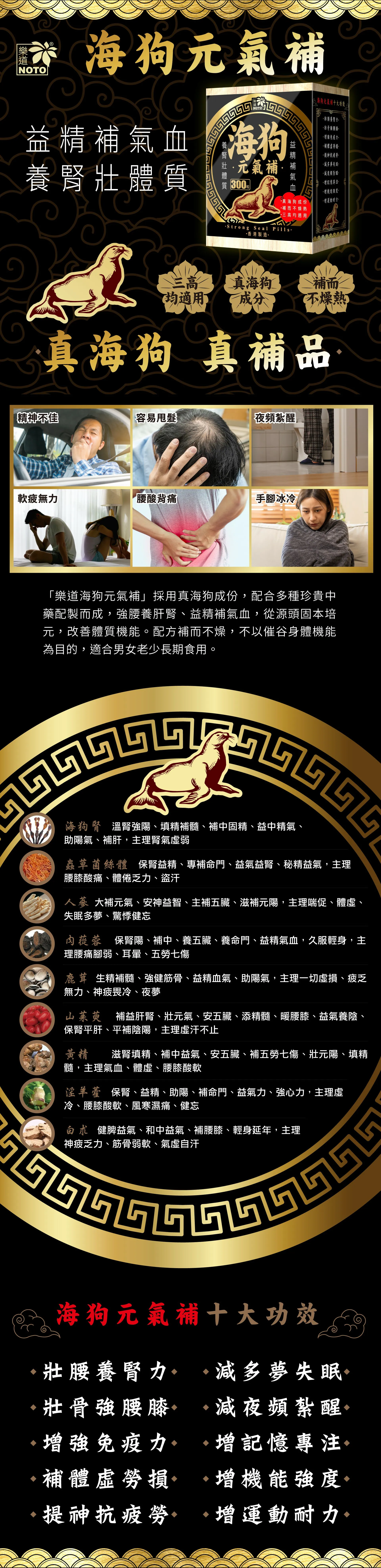 益精補氣血 · 養腎壯體質 · 補而不燥熱 · 真海狗成份 · 三高均適用 · 十大功效 服用方法 每日1次,每次4至8 包裝規格 每盒共有300粒,每粒淨重200毫克 成分 淫羊藿(蒸曬)、山茱萸(蒸曬)、黃精(蒸曬)、白朮(炒)、肉蓯蓉(蒸曬)、海狗腎(蒸)、鹿茸(蒸曬)、人蔘(蒸曬)、蟲草菌絲體、秘魯瑪卡、馬來西亞東革亞里