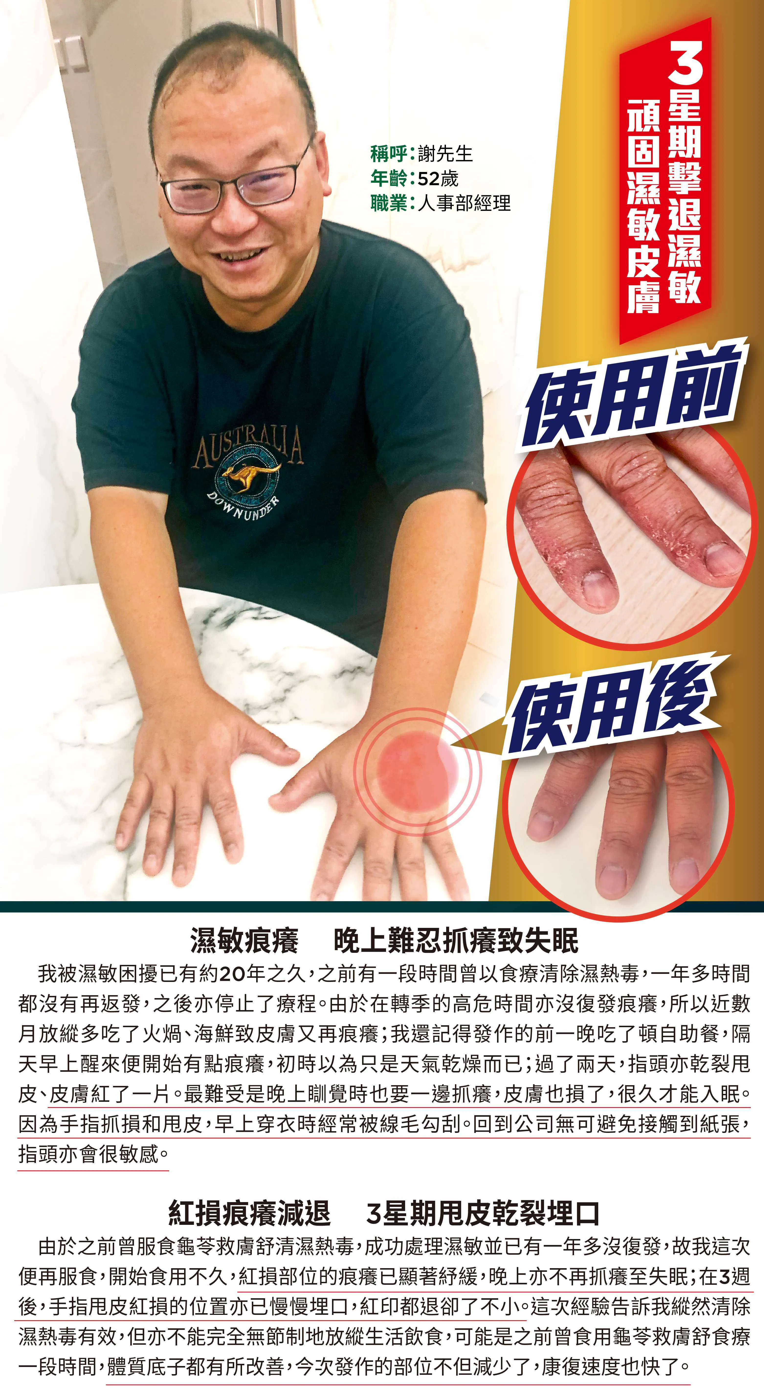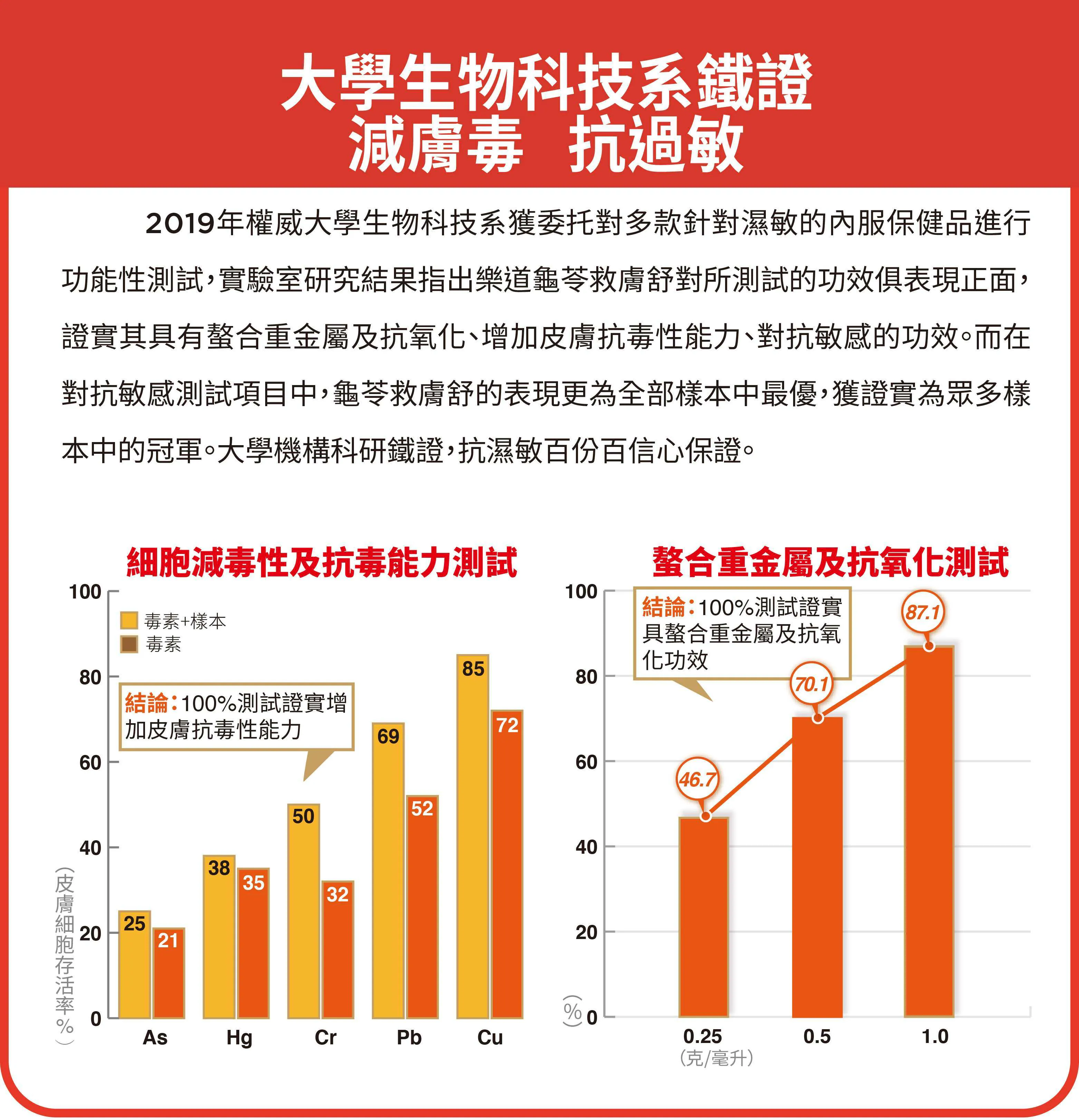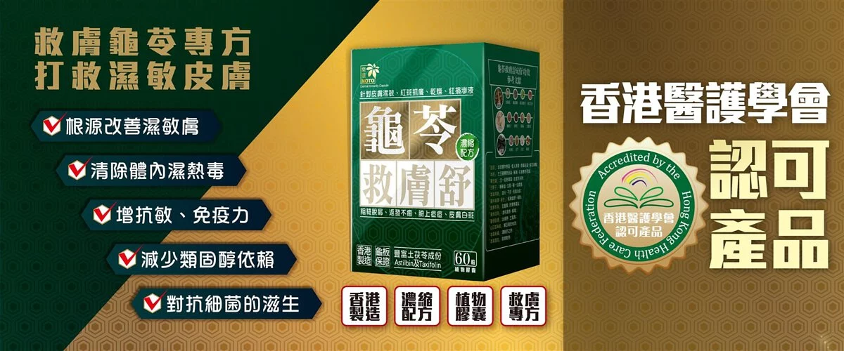 改善濕敏的痕紅乾裂 添加專利紫蘇籽成份 清除皮膚濕、熱、毒 成分 士茯苓、生地黃、麥芽糊精、龜板、紫蘇籽萃取、金銀花、牛蒡子、蒺藜、綿茵陳、白芷、決明子、廣金錢草、陳皮、破壁靈芝孢子粉、龜(去內臟)、甘草、紫錐花、E551(抗結劑)、E572(抗結劑) 功效 《龜苓救膚舒》採用「國家衛生部門」所頒布龜苓膏標準成份為配方基礎,並配伍多種針對皮膚症狀的草本漢藥改良,以加強清除濕、熱、毒功效,從根本調理,達至深入清除濕敏之效。濃縮配方含豐富份,並添加專利紫蘇籽萃取,有效對抗濕敏痕、紅等症狀。 建議用量 保健:每日1次,每次3粒;嚴重: 每日2次,每次3粒 配方適合3歲至10歲小孩,服量減半即可 包裝規格 每盒 60粒,每粒450 毫克 注意事項 嬰兒、孕婦慎用,請徵詢醫護人員的意見 保健產品,不代替醫囑 取材天然 – 每批次顏色、質感、味道可能略有不同