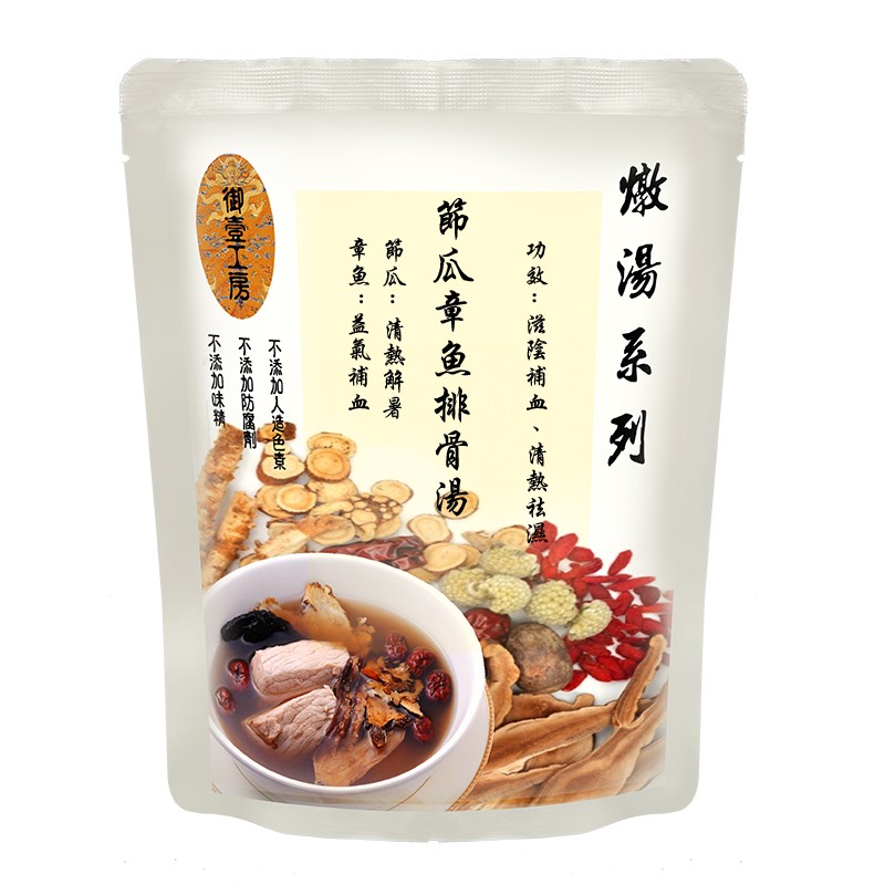 功效 : 滋陰補血、清熱祛濕 成分 : 水,節瓜,排骨,章魚,花生,薏米,蜜棗,陳皮,鹽 淨重400克 無添加味精, 防腐劑, 人造色素 加熱3分鐘即可飲用 內含湯渣,真材實料 無需冷藏,常溫存放