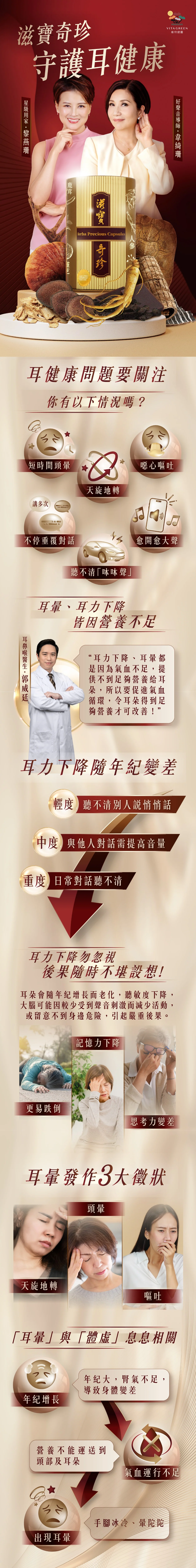 滋寶奇珍 蘊含20種珍貴典藏中藥 促進血液循環,為耳朵提供營養,改善耳力下降問題 改善耳脈失養,紓緩頭暈耳暈 超過9成用家認同4星期改善耳健康問題* 超過9成用家認同1個月有助改善聽敏度** *2023年滋寶奇珍問卷調查受訪人數143位。耳健康問題包括耳暈、耳朵不適等。 人蔘、靈芝、鹿茸、鹿角膠、龜甲、制何首烏、杜仲、當歸、巴戟天、補骨脂、枸杞子等二十種天然名貴中草藥製成。 受耳暈、耳力下降等耳健康問題困擾人士 氣血兩虛、容易腰酸、頭暈、疲倦者 用量:口服,每日2次,每次1-2粒