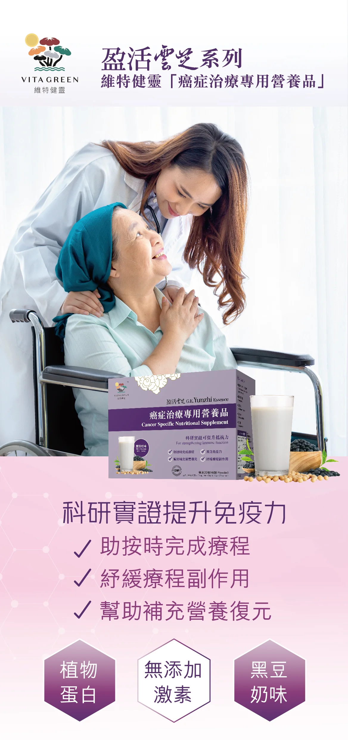 癌症治療專用營養品(20包) •科研實證提升免疫力,補充營養 •90%用家滿意*,有助按時完成療程、改善胃口/食慾不振、提升精神/緩解疲倦、緩解噁心不適等 •含豐富大豆植物蛋白質,無添加激素 •黑豆奶味,即沖即飲,方便美味 •適合對乳糖、麩質敏感人士 盈活雲芝系列「癌症治療專用營養品」,主要成分包括:大豆、黑豆、雲芝、維他命D,配方蘊含5大營養素,包括PSP(多醣肽)、PSK(多醣體)、β-葡聚醣、大豆異黃酮、 植物蛋白質。 接受電療、化療、手術、標靶治療的患者 接受大型手術的患者 長期體弱人士 營養不良人士 家族史保健 日常保健:每日2次,每次1包 療程前一星期:每日4次,每次1包 療程期間:每日4次,每次1包 療程後:每日3次,每次1包 沖調方法: 將一包「癌症治療專用營養品」粉裝,加入160毫升熱水(50度或以上),攪拌均勻後飲用。 ^注意沉澱物產生乃屬自然現象,請於飲用前充分攪拌。