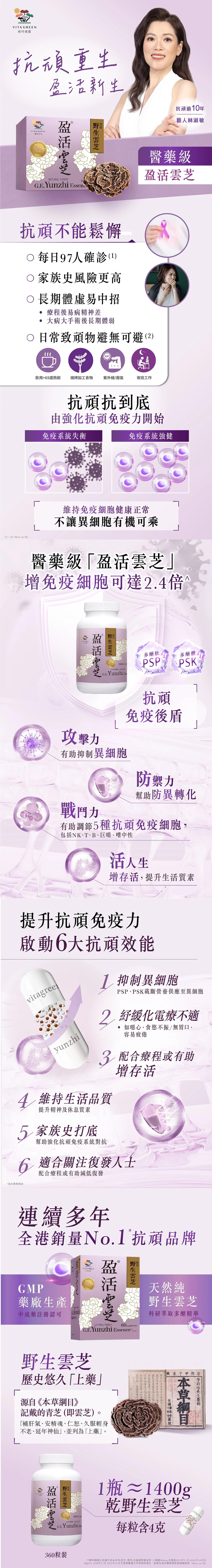 「盈活雲芝」100%野生雲芝 100%純野生雲芝提煉,雲芝精華濃度高 科技提取兩大強免疫活性成分,雲芝多醣肽(PSP)及PSK(多醣體) 免疫細胞可增達2.4倍+ 紓緩化療電療等療程不適 適合各種頑症、術後/頑後欲調理身體人士、家族頑症人士、長期體弱人士 純天然野生雲芝 頑症人士​ ​ 關注家族史人士​ 長期體弱​(大病/手術後)​ 長期體弱:每日2次,每次2粒​ 家族史:每日2次,每次2粒​ 治療前:每日2次,每次2-3粒​ 治療中:每日2次,每次4粒​ 康復期:每日2次,每次2-3粒