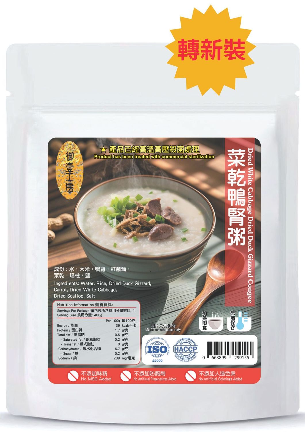 成份 : 粥(水,大米,鹽,糖),鴨腎,紅蘿蔔,菜乾,瑤柱 淨重400克 無添加味精, 防腐劑, 人造色素 加熱3分鐘即可飲用 無需冷藏,常溫存放