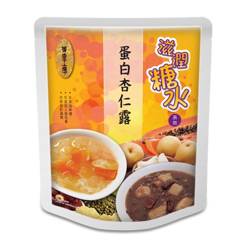 成份 : 水,雞蛋白,杏仁,大米,冰糖 淨重400克 無添加味精, 防腐劑, 人造色素 加熱3分鐘即可飲用 無需冷藏,常溫存放