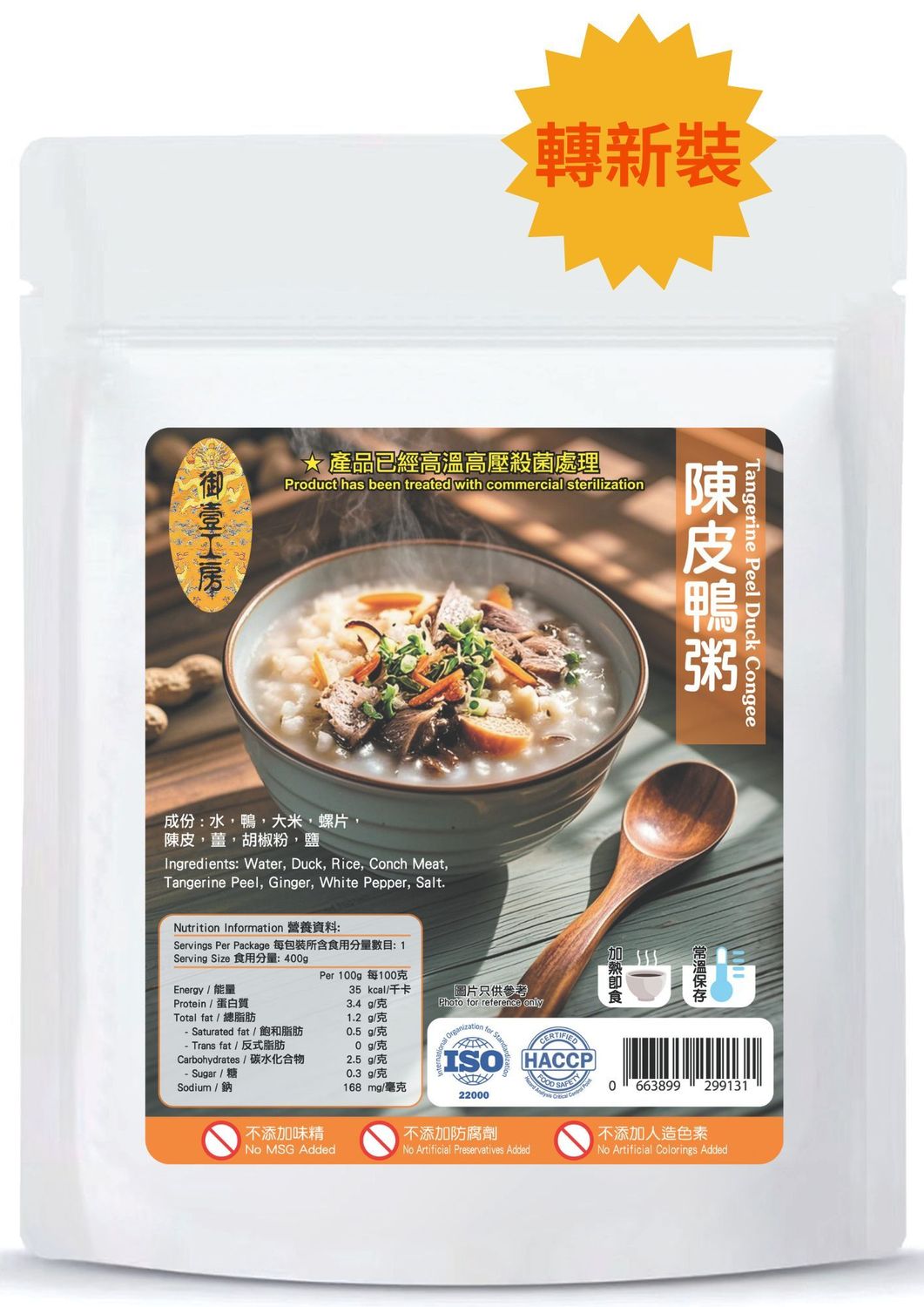 成份 : 水,鴨,大米,螺片,陳皮,薑,胡椒粉,鹽 淨重400克 無添加味精, 防腐劑, 人造色素 加熱3分鐘即可飲用 無需冷藏,常溫存放