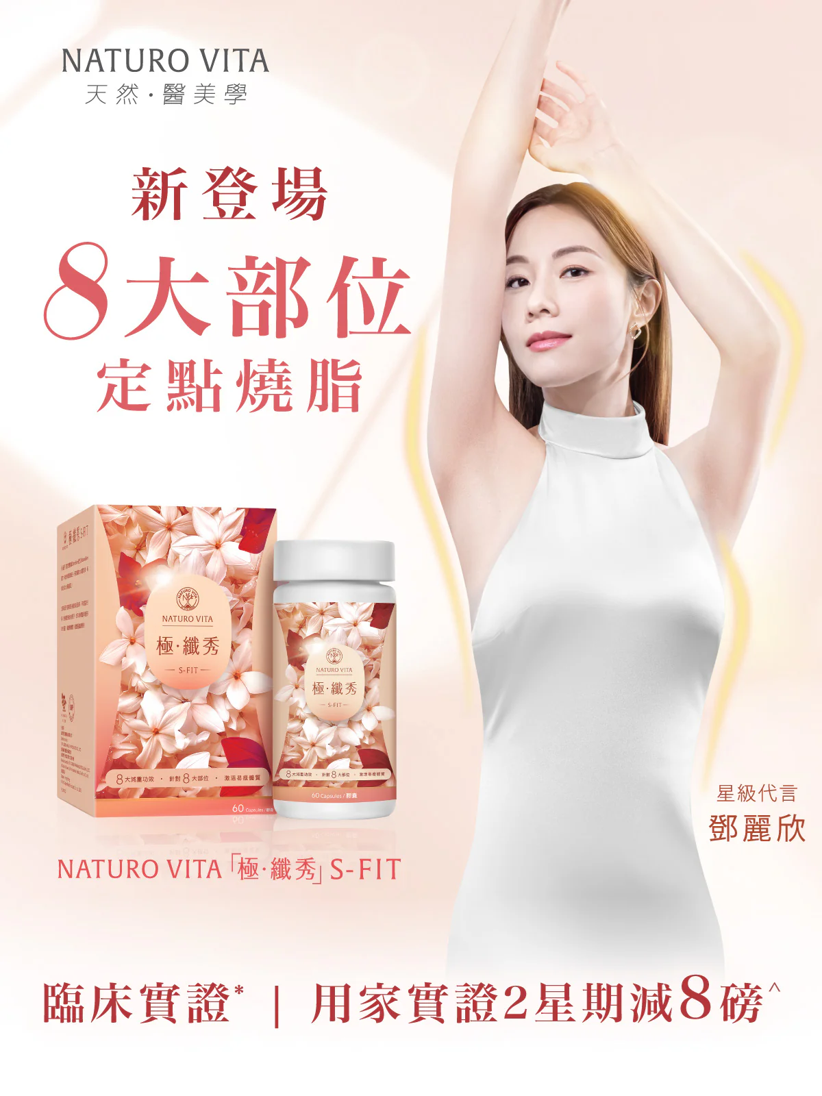 極·纖秀 S-Fit蘊含雙重獨家SlimmBvrn配方及NaturoBvrn配方,結合中西減脂成分,有效達致8大減重功效,有助減走8大脂肪部位!雙臨床實證,減體脂、內臟脂、降BMI*。真人實測,2星期減高達8磅^。雙重配方能夠促進身體的能量消耗,有助脂肪分解,使身體在靜止狀態下,也可以無間斷消耗更多卡路里*,啟動易瘦體質,塑造輕盈健康體態! *Data on File, 需配合均衡飲食及適量運動 ^根據生活易於2025年對93名女性試用者(BMI介乎20.0至31.6)進行30天產品使用意見調查,其中有6名試用者於2星期內減重8磅,4星期減重10磅。需配合適當運動及飲食,效果因人而異。 SlimmBvrn 配方(褐藻,決明子,黃精,梔子,茯苓),NaturoBvrn配方(蘋果多酚,楊梅黃酮,α-硫辛酸,L-肉鹼,褐藻素),膠囊(羥丙基甲基纖維素,色素(171),水,膠凝劑(407,508)),抗結劑(551,470(iii))。 口服,每日2次,每次3粒