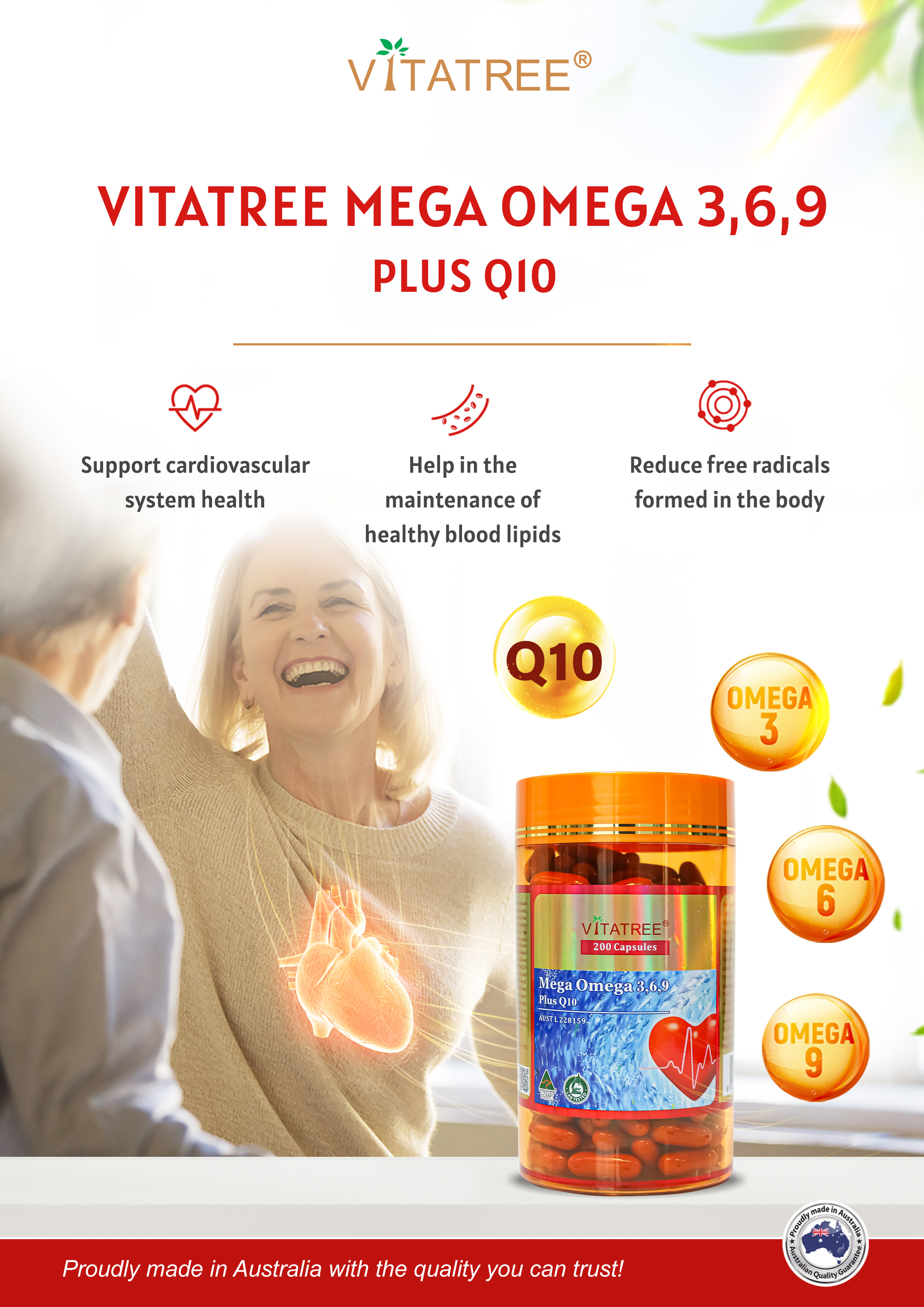 VITATREE奧米加 369 PLUS Q10提供完美的成分組合比例,是維持心臟、心血管及腦部健康的強大後盾。Omega 3和6 都是不飽和脂肪中的多元不飽和脂肪酸,屬人體必需脂肪酸,由於身體不能自行合成,所以只能從飲食中攝取。 Omega 9 是單元脂肪酸,除了有助降低「壞」膽固醇之外,還能提升「好」膽固醇,是Omega脂肪酸中唯一能對人體產生如此效用,所以攝取足夠的Omega 9 能減低患心血管疾病的機會。潻加Q10 有助保護細胞免受自由基傷害及有助心臟健康。 促進血液循環及心腦血管健康 改善專注力及記憶力 適合三高人士服食 促進眼睛健康 強化肌肉,潤滑關節組織 每粒膠囊含: 月見草油 - 333毫克 亞麻籽油 - 333毫克 天然魚油 - 333毫克 · 相等於 DHA 40毫克 · 相等於 EPA 60毫克 · 相等於 三酸甘油酯 100毫克 輔酶Q10– 15毫克 產品規格/特性: 主要成份: 每粒膠囊含: 月見草油 - 333毫克 亞麻籽油 - 333毫克 天然魚油 - 333毫克 • 相等於 DHA 40毫克 • 相等於 EPA 60毫克 • 相等於 三酸甘油酯 100毫克 輔酶Q10 – 15毫克" 功效: ~促進血液循環及心腦血管健康 ~適合三高人士服食 ~改善專注力及記憶力 ~強化肌肉,潤滑關節組織 包裝 / 規格: 每瓶200粒 服用方法: 成人每日2次,每次1粒; 小童每日1粒; 餐後食用