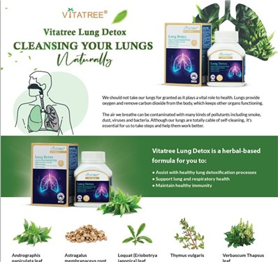 VITATREE 補肺排毒配方主要由草本提取而成,促進肺部的運作,有助排走肺部內藏的毒素,從而維持上呼吸道健康。中西合璧,助你健康地渡過疫症。 毛蕊花: 有清熱解毒之效 枇杷葉: 具有清肺化痰、止咳功效 百里香: 可以抗菌防疫及增強上呼吸道健康 功效: 舒緩「長新冠」後遺症,加速康服能力 (味覺、食慾等) 改善氣促,乾咳,喉嚨不適等症狀 增強上呼吸道健康,提昇抗病能力 減少垃圾積聚在肺部,使肺部暢順運作 產品規格/特性: 主要成份: 毛蕊花、黃耆提取物、百里香、穿心蓮提取物、枇杷葉、硒酵母 功效: ~舒緩「長新冠」後遺症,加速康服能力 (味覺、食慾等) ~改善氣促,乾咳,喉嚨不適等症狀 ~增強上呼吸道健康,提昇抗病能力 ~減少垃圾積聚在肺部,使肺部暢順運作 包裝 / 規格: 每瓶60粒 服用方法: 成人每日早晚各1粒,小童每日1粒; 餐後食用