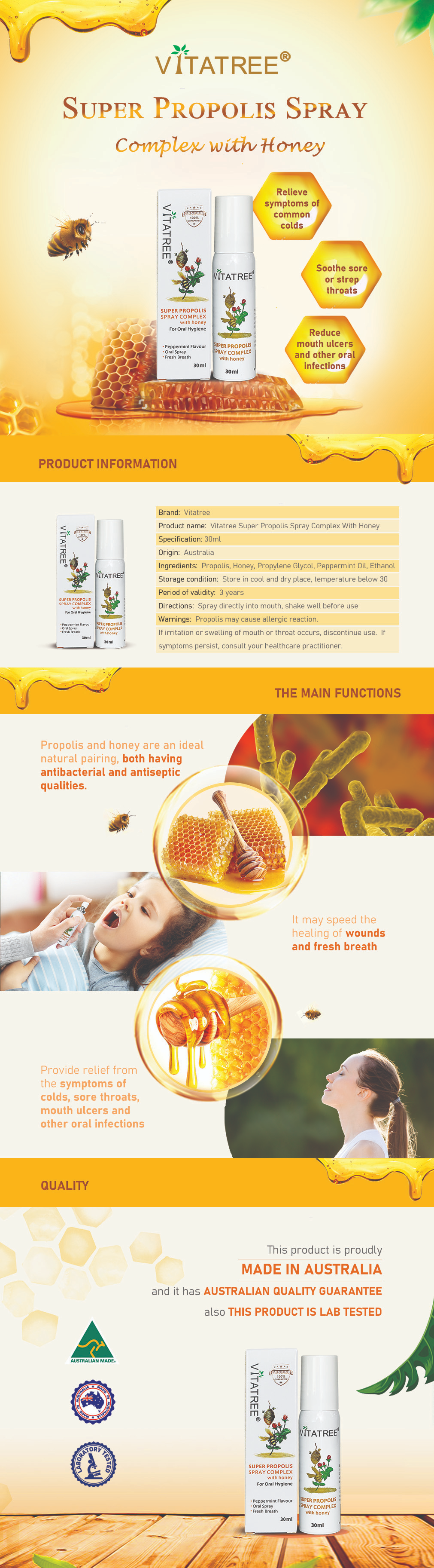 蜜蜂會採集樹脂或樹液,並混合自己分泌出的酵素製成抗菌的蜂膠,塗在蜂巢每個入口,所以 蜂膠是抵抗病毒入侵的天然屏障。VITATREE 將高濃度蜂膠製成方便易用的喉部噴劑。 進食前噴一噴減少口腔細菌 加快口腔潰瘍(痱滋)復原, 舒緩喉嚨不適 有助清新口氣 外塗有助傷口復原 產品規格/特性: 主要成份: 蜂膠、蜂蜜、丙二醇、薄荷精油、乙醇 功效: ~進食前噴一噴減少口腔細菌 ~加快口腔潰瘍(痱滋)復原, ~舒緩喉嚨不適 ~有助清新口氣 ~外塗有助傷口復原 包裝 / 規格: 每瓶30毫升 服用方法: 使用前搖勻,按需要直接在口腔內噴2-4次 (2歲以下切勿使用,或先諮詢醫生意見)