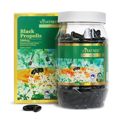 黑蜂膠是蜜蜂採集植物的汁液丶嫩芽或花蜜,混合自己分泌的唾液與蜜臘,所形成的深褐色膠狀物,用來修補蜂巢,防止細菌或病毒入侵蜂巢。 VITATREE 黑蜂膠2000 由2000mg天然蜂膠濃縮成400mg的蜂膠膠囊,濃度極高,除了類黃酮素及胺基酸之外,還有維他命A,B,C,E等元素,是抵抗病毒入侵的天然屏障。 l強化呼吸道健康、增強免疫力 l舒緩鼻敏症狀 l維持喉嚨及口腔健康,減少痱滋 l保持腸胃健康 產品規格/特性: 主要成份: 每粒膠囊含400mg黑蜂膠提取物 (相等於2000mg天然蜂膠) 功效: ~強化呼吸道健康、增強免疫力 ~舒緩鼻敏症狀 ~維持喉嚨及口腔健康,減少痱滋 ~保持腸胃健康 包裝 / 規格: 每瓶365粒 服用方法: 成人每日2次,每次1粒; 小童每日1粒; 餐後食用