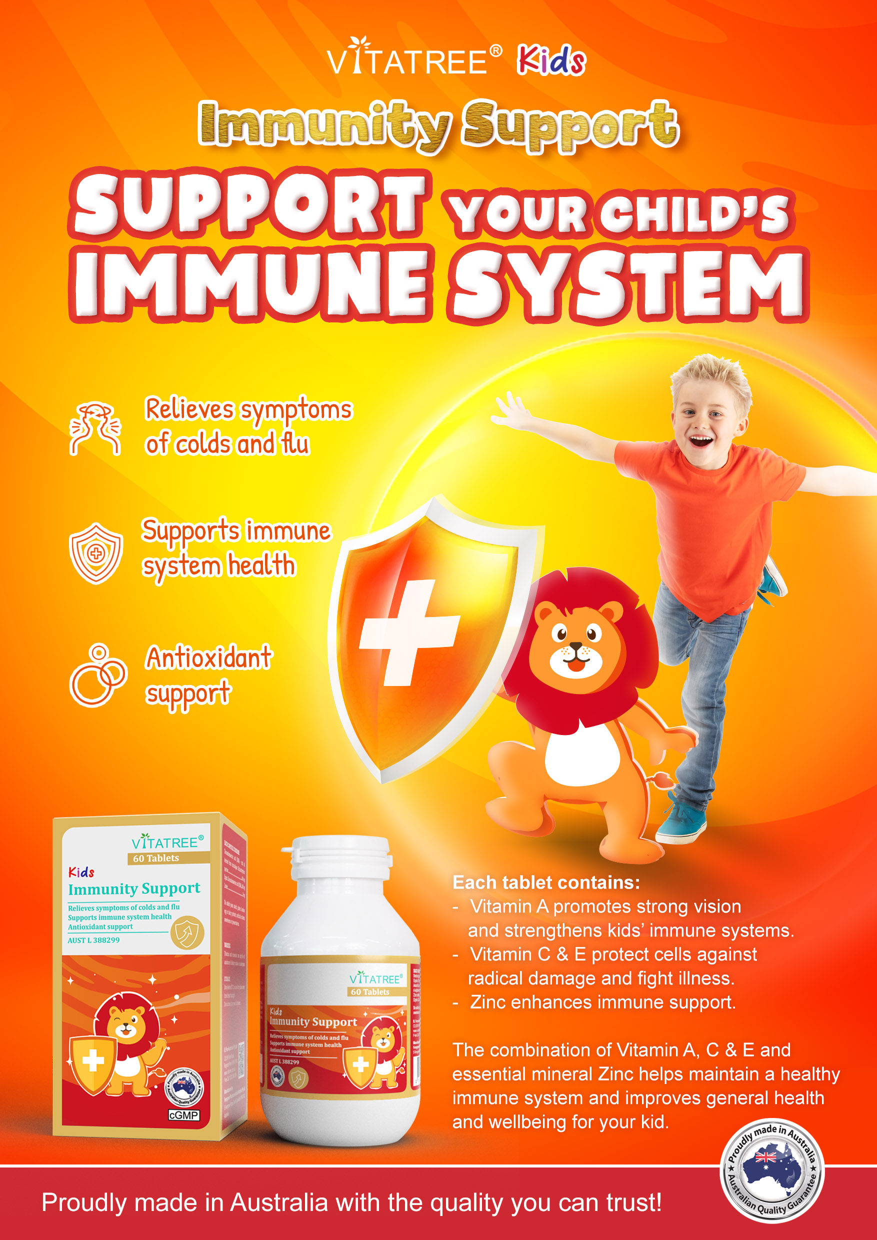含有兒童最容易缺乏的維他命及礦物質 ~ 減少傷風感冒症狀 ~ 提昇整體免疫力 ~ 支持眼睛健康 ~ 天然香橙味 每粒含有: ~維他命A - 400mcg ~維他命C - 60mg ~維他命E - 25.15mg ~鋅 – 1.9mg (不含人造色素、麩質及防腐劑) 產品規格/特性: 主要成份: ~維他命A - 400mcg ~維他命C - 60mg ~維他命E - 25.15mg ~鋅 – 1.9mg 功效: ~ 減少傷風感冒症狀 ~ 提昇整體免疫力 ~ 支持眼睛健康 包裝 / 規格: 每瓶60粒 服用方法: 服食建議: ~ 4- 8歲: 每日1粒 ~ 8歲以上: 每日2粒; 或遵照醫師指示服食