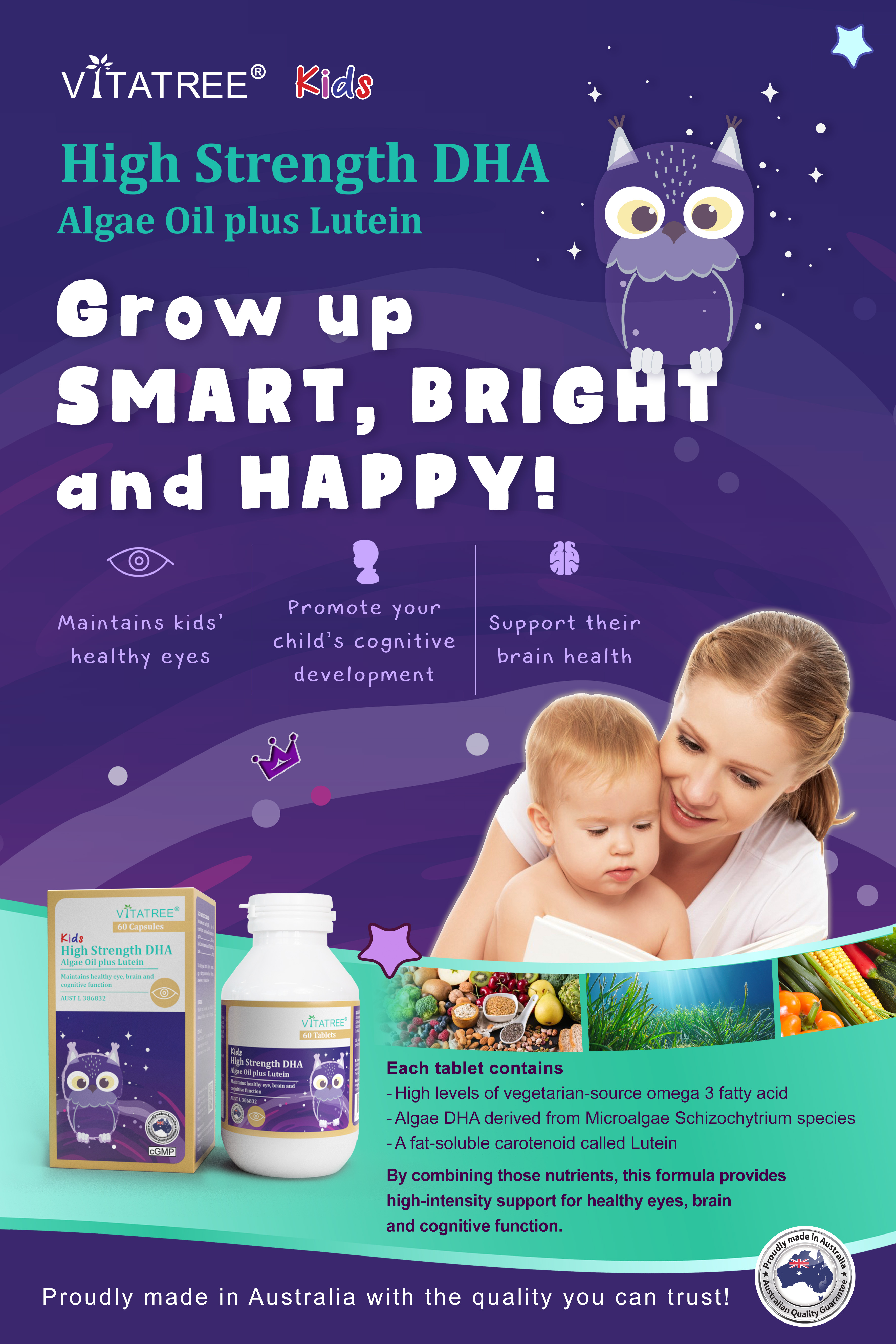 每粒含有: ~藻油 400mg, 相等於合有160mg DHA ~葉黃素 5mg (不含麩質及防腐劑) 產品特點: ● 植物Omega 3來源, 無魚腥味 ● 支持眼睛健康, 對抗藍光傷害 ● 有助兒童腦部發展 ● 增強認知及學習能力 產品規格/特性: 主要成份: ~藻油 400mg, 相等於合有160mg DHA ~葉黃素 5mg 功效: ● 支持眼睛健康, 對抗藍光傷害 ● 有助兒童腦部發展 ● 增強認知及學習能力 包裝 / 規格: 每瓶60粒 服用方法: 服食建議: ~ 2-7 歲: 每日1粒 ~ 7歲以上: 每日2粒; 或遵照醫師指示服食 (如未能整粒吞服可將膠囊剪開及將精華液擠入飲品或直接食用)