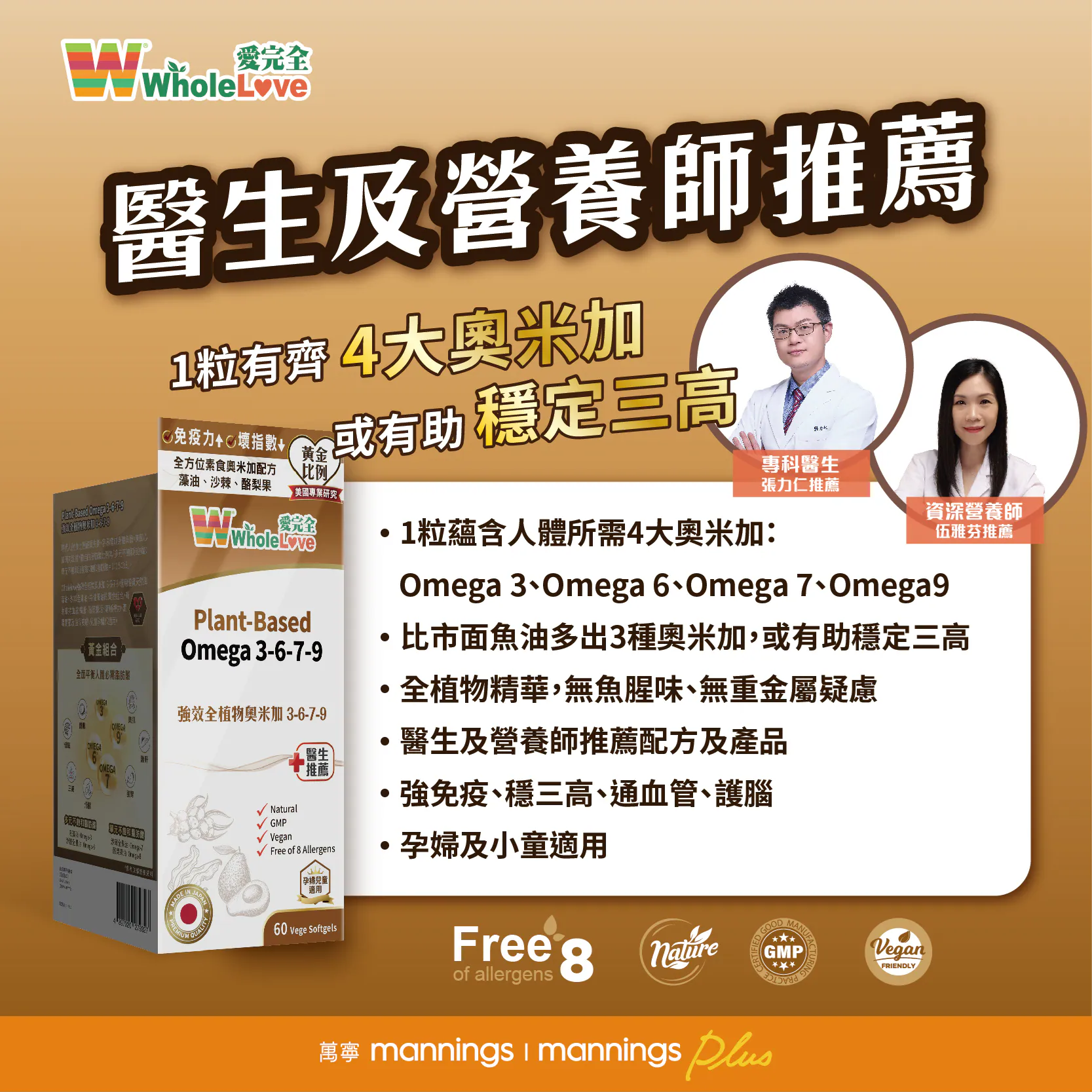 Wholelove 強效全植物奧米加 3-6-7-9 - 1粒蘊含Omega3、Omega6、Omega7、Omega9,全面平衝人體脂肪酸。選用優質天然海藻油、沙棘全果油、牛油果油,這個營養油組合平衡了人體必需的奧米加-3 和奧米加-6 多元不飽和脂肪酸。另外,奧米加-7及奧米加-9,有助暢通血管、抗三高、腦筋靈活及強免疫。 十大功用 降三高強機能 •抗三高,維持心血管健康 •掃走血管垃圾,暢通血管 •抗紅熱反應 •改善乾眼,增強眼睛健康 •活腦護腦,增強記憶思考力 •提升骨骼強度,強化關節 •滋潤肌膚,改善皮膚狀況 •抗疫勞,提升睡眠品質 •此產品或有助於穩定膽固醇 •紓緩中招及長後遺徵狀 主要成分 酪梨果、藻油、沙棘全果油 包裝規格 每樽60粒 / 每粒880毫克,連膠囊 使用方法及食用分量 保健食法:每日1次,每次2粒 加強食法:每日2次,每次2粒 3-5歲兒童,建議直接將膠囊剪開,將液體加到食物中食用。 建議連續服用3個月,以達至產品基本保健效果。 產地 日本 注意事項 保健產品,不代表醫囑 取材天然,每批次顏色、質感,味道可能略有不同 儲存方法 置於陰涼乾燥處 >此產品沒有根據《藥劑業及毒藥條例》或《中醫藥條例》註冊。為此產品作岀的任何聲稱亦沒有為進行該等註冊而接受評核。此產品並不供作診斷、治療或預防任何疾病之用。