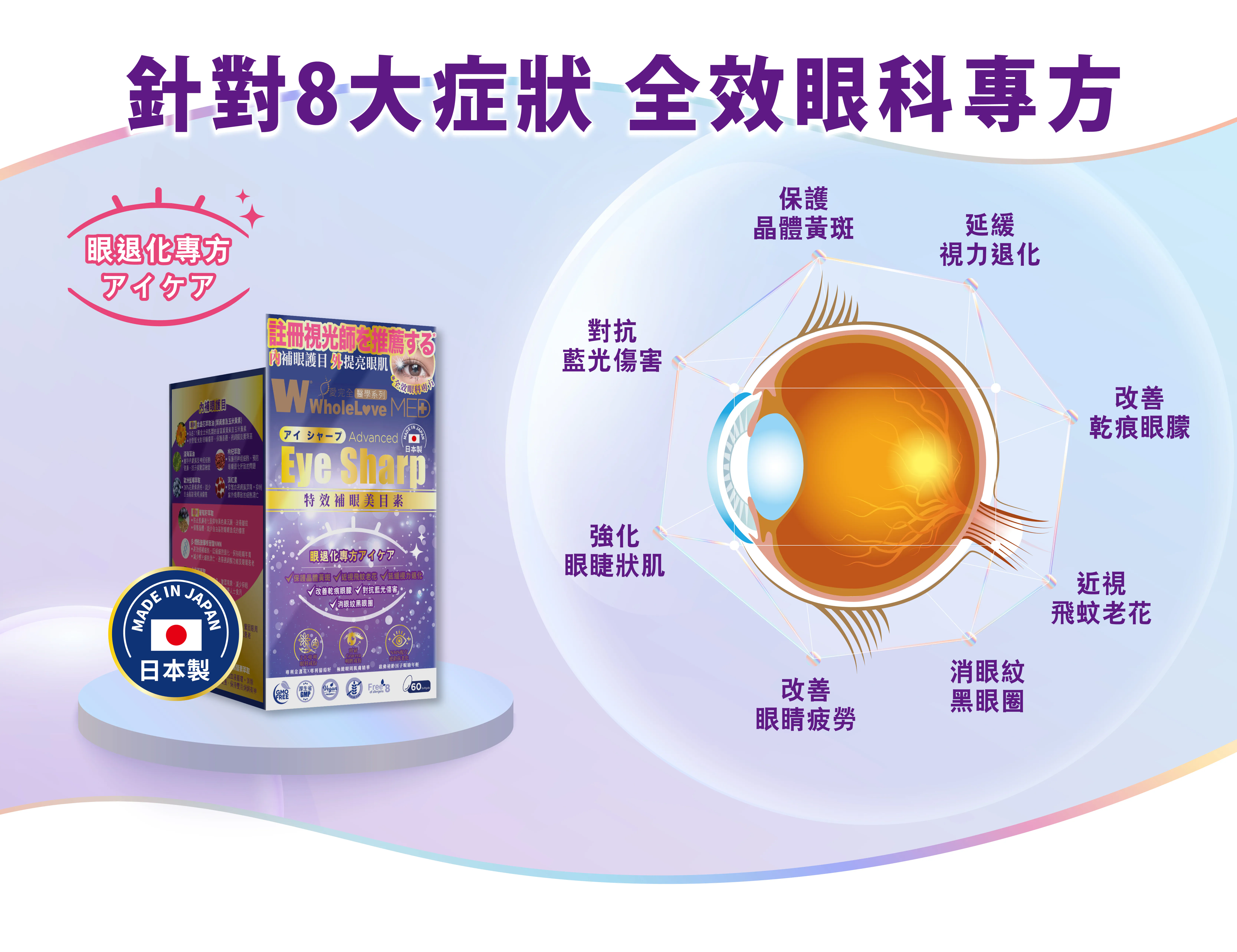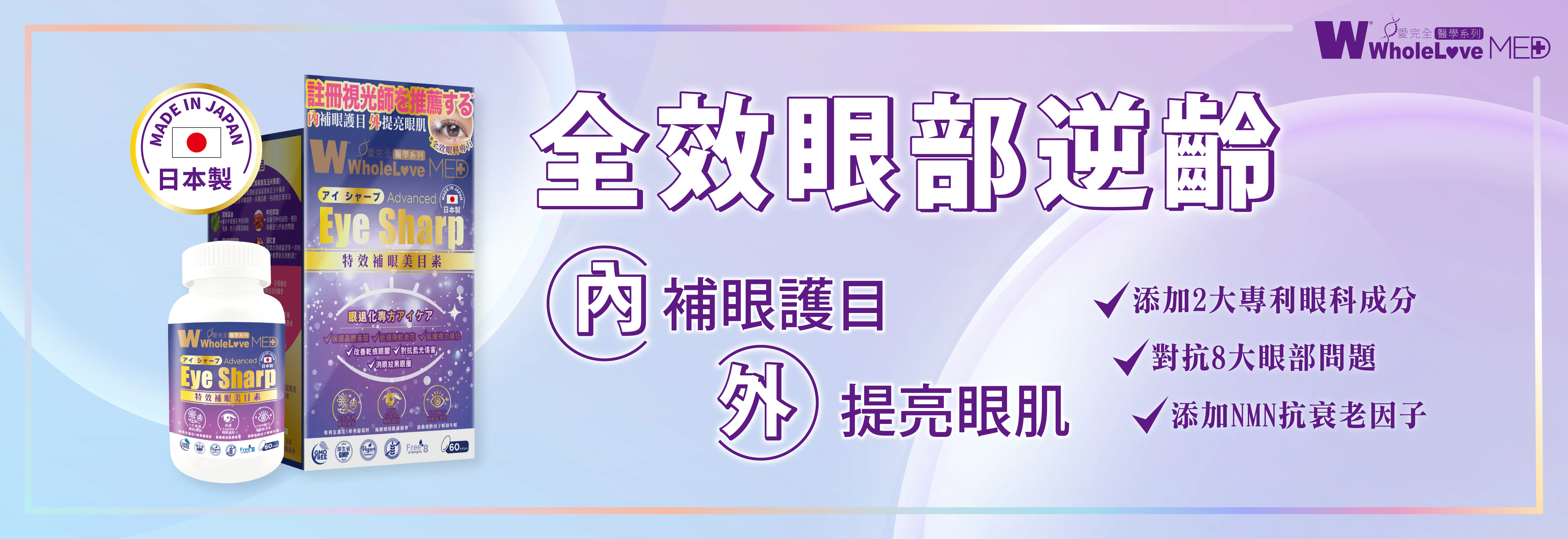 愛完全醫學系列特效補眼美目素配方專為亞洲人而設,嚴選14種護眼美目成分,首創添加科研成分Gracera及金盞花、葡萄籽兩大補眼美目專利成分,特別加入逆齡抗老因子NMN,全方位對抗8大眼科問題,內外補眼美目,成分更獲香港註冊眼科視光師推薦。 對抗8大眼科問題:保護晶體黃斑、延緩視力退化、改善乾痕眼矇、近視飛蚊老花、消眼紋黑眼圈、改善眼睛疲勞、強化眼睫狀肌、對抗藍光傷害。 內補眼護目 兩大專利眼科成分: 金盞花萃取油 (以5:1黃金比例配製豐富葉黃素及玉米黃素) 【防藍光、保護視力】針對藍光對眼睛的傷害,保護晶體、視網膜及黃斑區 葡萄籽萃取: 【美肌】 防止肌膚老化及抑制黑色素沉澱,改善皺紋 【保護晶體】減少自由基對眼睛造成的傷害 NMN逆齡因子抗老化: NMN (β-煙酰胺單核苷酸) 【修復細胞】高效修補細胞,延緩細胞退化,保持眼睛年輕 減少感光細胞凋亡,改善視網膜功能及對抗眼睛衰老 其他補眼成分: 深海藻油:維持視網膜及神經細胞健康,提升視覺靈敏度 枸杞萃取:保護視神經細胞,預防眼睛退化所致的問題 藻紅素: 穿越血視網膜屏障,抑制紫外線導致的細胞凋亡 小米草萃取: 舒緩敏感引致的眼痕、酸澀現象,減少揉眼 適合眼睛疲勞及黑眼圈困擾的人士食用 外提亮眼肌 科研Gracera明眸成分 神經醯胺:修復受損皮膚,鞏固眼周皮膚屏障,對抗衰老 透明質酸:增加皮膚的含水量,保濕並改善眼睛肌膚彈性 黑醋栗萃取:增加血液循環,減淡黑眼圈,保持雙目炯炯有神 適用人士: √ 長時間使用電腦及手機 √ 經常閱讀及觀看電視 √ 配戴隱形眼鏡或眼鏡 √ 曾接受矯視及眼科手術 √ 有近視、老花、飛蚊 √ 男女士、學童及小孩 √ 中年至老年眼睛衰退 √ 痕養、乾澀及畏光 √ 眼紋、眼袋及浮腫 √ 黑眼圈、紅筋、疲倦 品質安全認證 無基因改造成分 日本厚生省品質管理 純素配方 無麩質飲食 不含8大致敏原 服用方法 每日一次,每次一至兩粒 建議連續服用三個月,以達至最佳補眼美目效果(適合6歲或以上人士食用) 產地 日本 包裝規格 每樽60粒,每粒650毫克* (重量包括膠囊) 成分 葵花油、專利金盞花萃取油 (比例5:1葉黃素和玉米黃素)、藻油、脂肪酸甘油脂 (E471 穩定劑)、山桑子 (歐洲藍莓) 萃取 (36%花青素)、枸杞萃取、小米草萃取、(米)神經醯胺、葡萄糖酸銅、鋅、藻紅素、透明質酸、維生素 E、專利葡萄籽萃取物、黑醋栗萃取、β-煙酰胺單核苷酸(NMN) 注意事項 請放置陰涼乾燥處,每日不多於三粒
