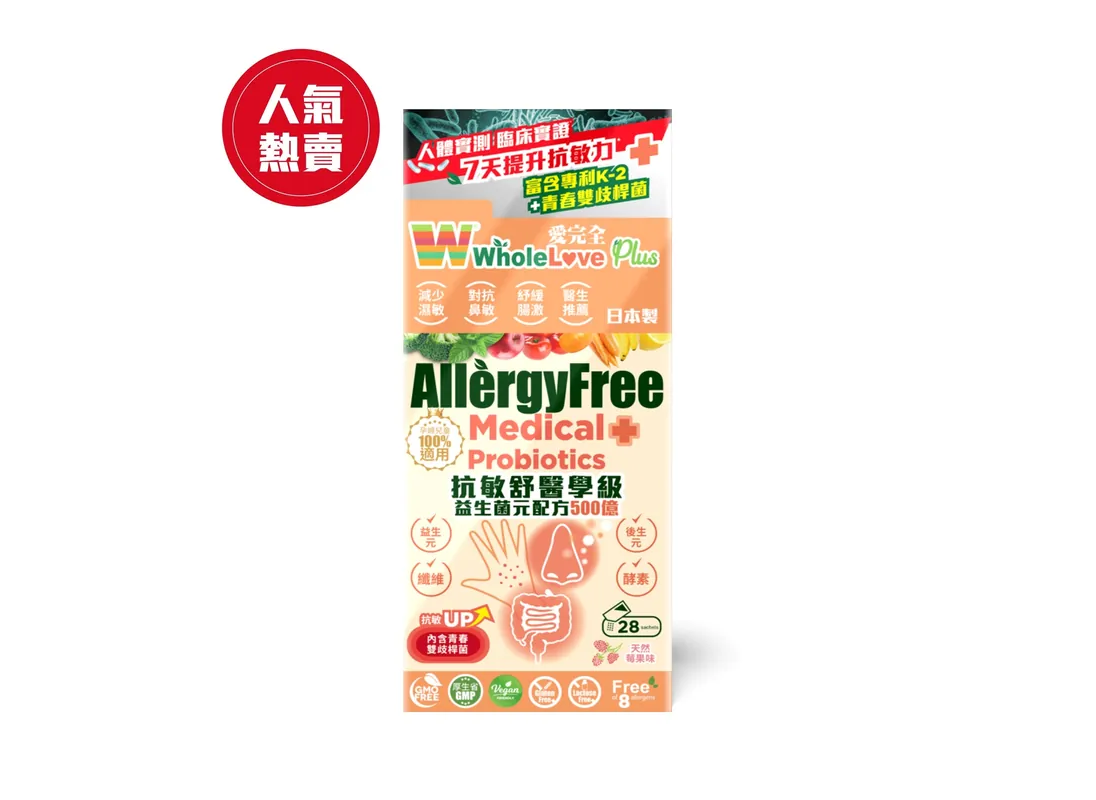 人體實測 臨床實證* 7天提升抗敏力* WholeLove Plus 抗敏舒醫學級益生菌元配方500億,採用醫學級益生菌專利植物性乳酸菌K-2,經臨床實證能減輕花粉引致的鼻不適、鼻敏症狀,如噴嚏、鼻塞、眼部痕癢等症狀。配方榮獲專科醫生推薦,富含青春雙歧桿菌,能對抗新型病毒,提升免疫力,抗敏效果更顯著。 專科醫生推薦 減少濕敏、對抗鼻敏、紓緩腸敏 產品榮獲專科醫生推薦,富含專利K-2+青春雙岐桿菌,減少濕敏、對抗鼻敏、紓緩腸敏。本產品經日本百年藥廠調配, 具有抗酸抗熱技術,粉末超幼細,直達腸道,容易吸收。 產品功效 解決3大敏症 : 濕敏、鼻敏、腸敏 1包 含 500億益生菌元 7天提升抗敏力 醫生推薦 專利益生菌 有人體實測 臨床實證 百年日本藥廠製造 具有抗酸抗熱技術 粉末超幼細,直達腸道,容易吸收 適合關注14大敏症問題人士 1. 疼痛瘙癢 2. 乾燥紅腫 3. 皮膚變厚 4. 乾裂脫皮 5. 鼻塞鼻水 6. 眼紅眼痕 7. 喉嚨痕癢 8. 咳嗽喉痛 9. 食物敏感 10. 腹痛易敏 11. 消化不良 12. 胃脹胃氣 13. 嚴重口臭 14. 黑眼圈 服用方法: 保健:每日1次,每次2包 嚴重:每日2次,每次2包 孕婦、成人分量相同 可直接入口服用、或開室溫水沖服 小童3-5歲, 每日1/3包 , 一星期後增至1/2包 小童6-12歲以下分量減半 淨重:每包 1.6克,共 28 包 注意事項: 內有益生菌,切勿用熱水沖服 無須冷藏,放置陰涼通風處 開封小包後請立即食用 保健食品,不代表醫囑 取材天然,每批次顏色、質感、味道可能略有不同 益生菌不應與抗生素同時服用 小童及長者需注意服用粉末時哽噎 ^Neveen Helmy Abou El-Soud (2015) Bifidobacterium lactis in Treatment of Children with Acute Diarrhea. A Randomized Double Blind Controlled Trial * 用家服用愛完全抗敏舒醫學級益生菌元配方500億7天後的數據,2022年6月,見效時間因人而異