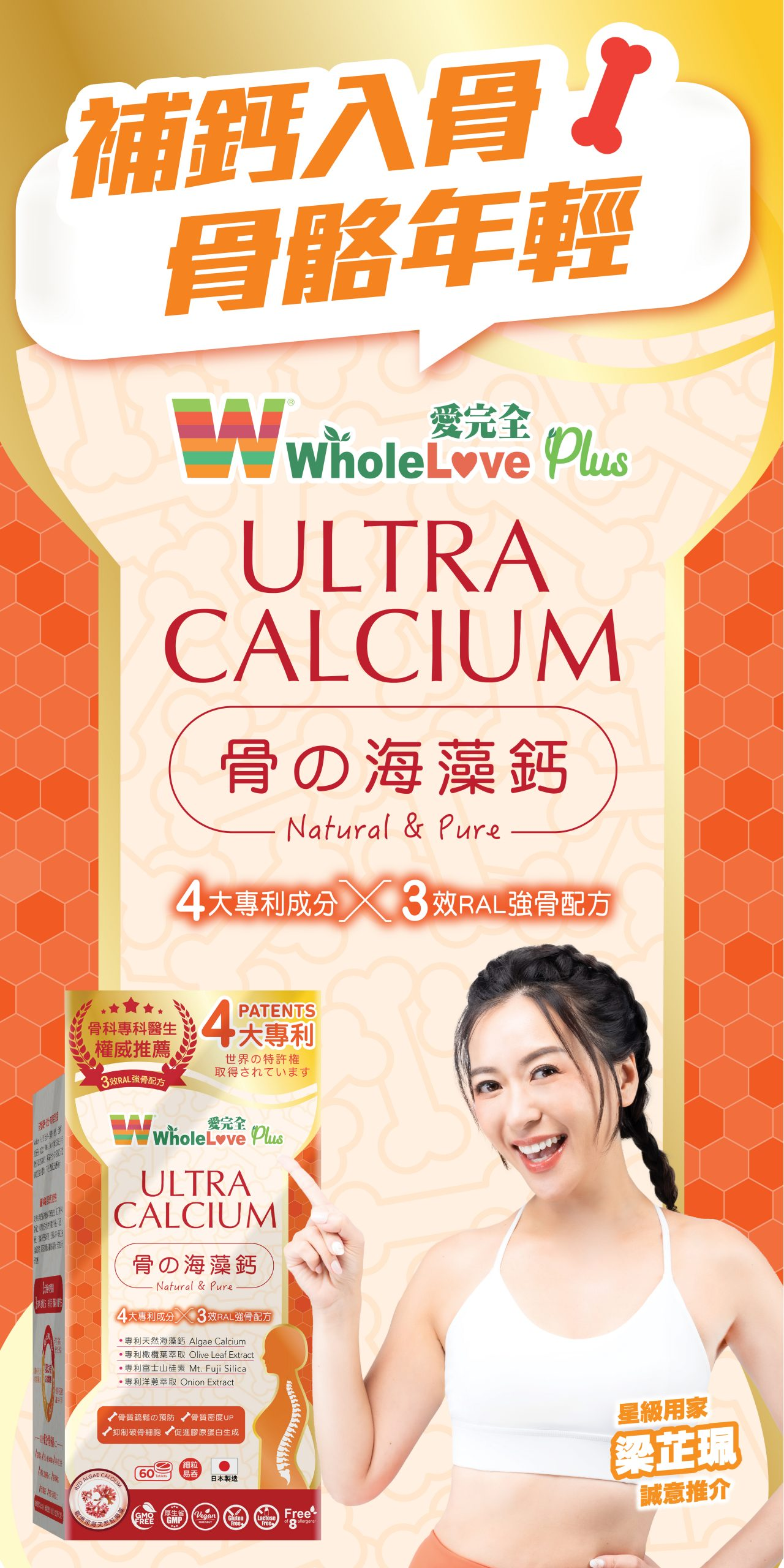愛完全 「骨の海藻鈣」採用深海天然紅海藻鈣,更易被人體吸收。集合4大專利成分及維他命D3等有效成分,建立3效RAL強骨配方,針對三大黃金補鈣關鍵:補鈣、吸鈣、鎖鈣,提升吸收率,同時堵截骨質流失,激活造骨細胞和抑制破骨細胞,全方位提升骨質狀態。配方更獲骨科專科醫生權威推薦,日本製造。 成分 CalPlus配方(天然海藻鈣、專利海藻鈣)、E965(穩定劑)、氧化鎂、E551(抗結劑)、E470(穩定劑)、維他命D3、鋅酵母提取物、專利洋蔥萃取、專利橄欖葉萃取、透明質酸、專利富士山硅素、綜合蔬果萃取、錳酵母提取物、β-胡蘿蔔素、銅酵母提取物、硒酵母提取物 適用人士 發育增高 成年人(特別30歲) 孕婦及授乳女性 腸胃消化功能較弱的人士 更年期婦女 年長銀髮族 密度不足骨彎人士 認證 GMO Free/厚生省GMP/Vegan/Gluten Free/Lactose Free/Free of Eight allergens 使用方法及食用分量 青少年(12-18歲):每日2粒 成人:(保健) 每日2粒;(加強) 每日3-4粒 懷孕婦女及哺乳媽媽:每日3-4粒 (建議連續服食3個月,以達至更佳效果) 包裝規格 每樽60粒 / 每粒650毫克 產地 日本 注意事項 保健產品,不代表醫囑 取材天然,每批次顏色、質感,味道可能略有不同 儲存方法 置於陰涼乾燥處